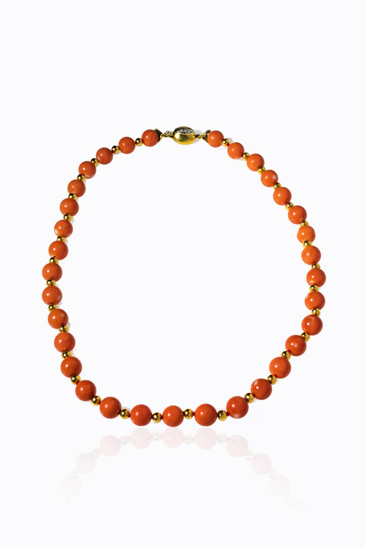 composto da un filo di sfere di corallo giapponese nei toni del salmone del diam. di mm 8,5, distanziali e chiusura in oro giallo.