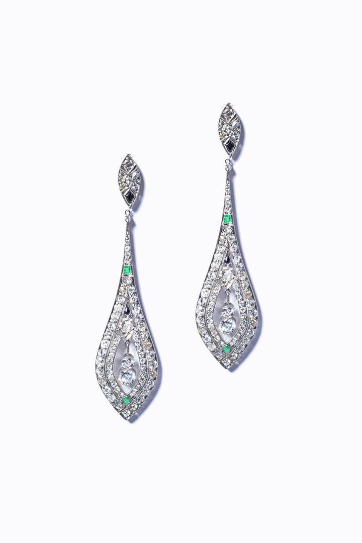 in oro bianco, in stile anni '20, con gocce pendenti in diamanti taglio brillante di vecchio taglio e 8/8 per totali ct 4,0 ca, inserti in onice e piccoli smeraldi a decoro
