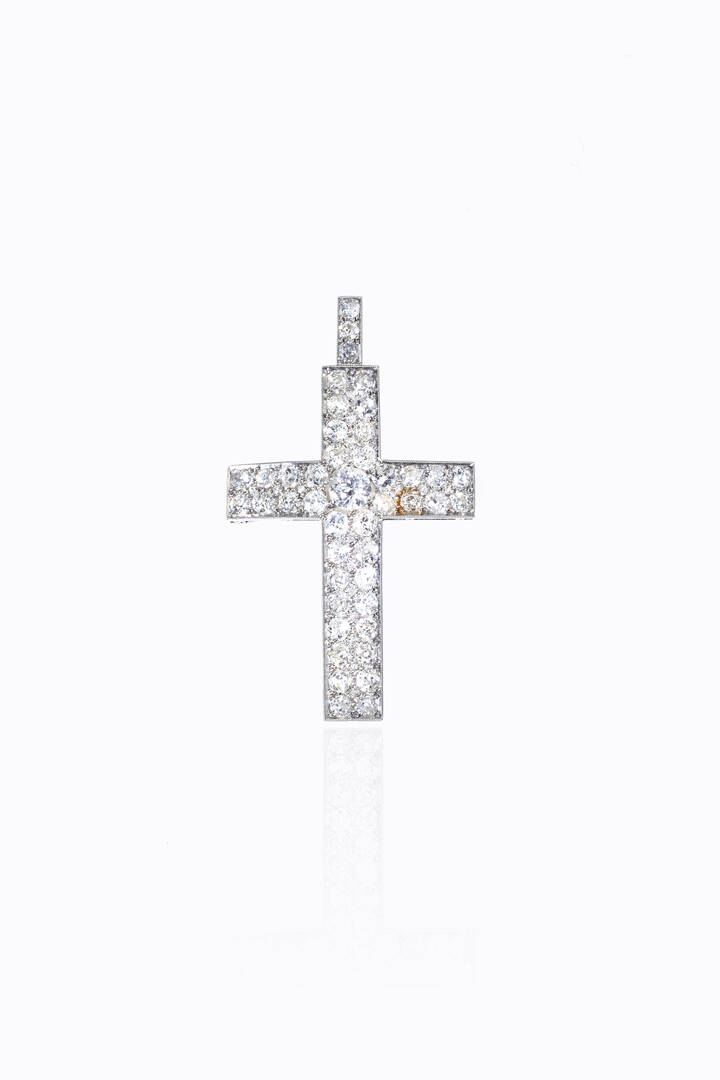 in platino, anni '20, a forma di croce con al centro un diamante di vecchio taglio di ct 0,90 ca e diamanti taglio brillante di vecchio taglio per totali ct 6,60 ca