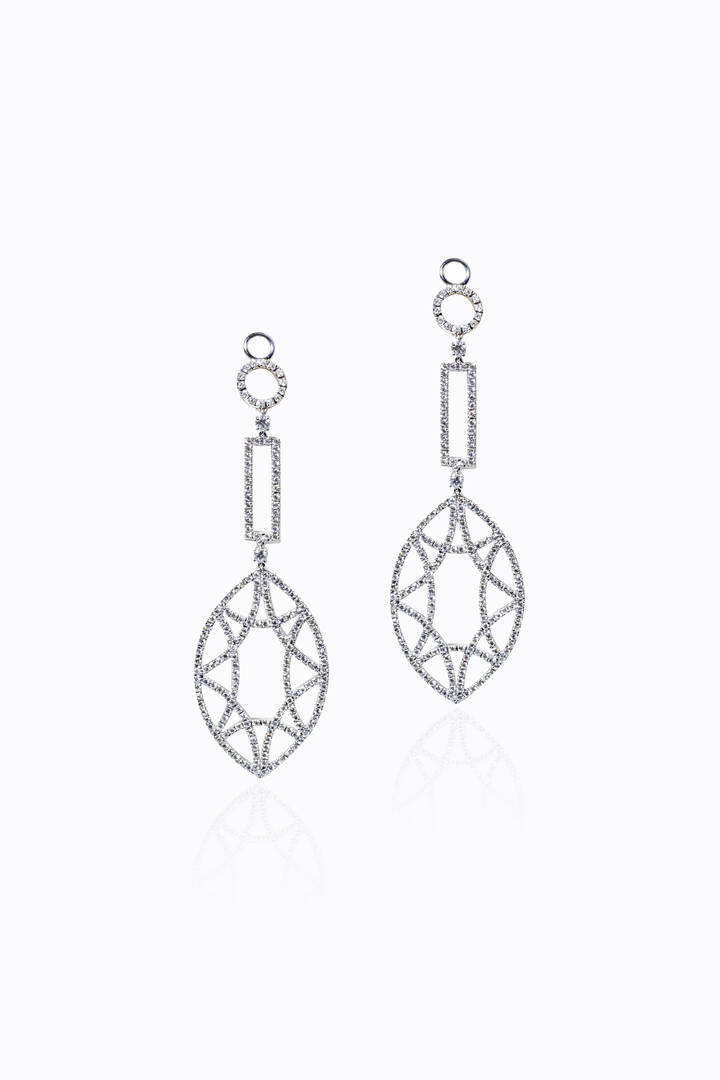 pendenti, in oro bianco, elementi geometrici terminanti con foglie stilizzate, in diamanti taglio brillante per totali ct 3,20 ca, probabile colore G-H, purezza IF-VVS