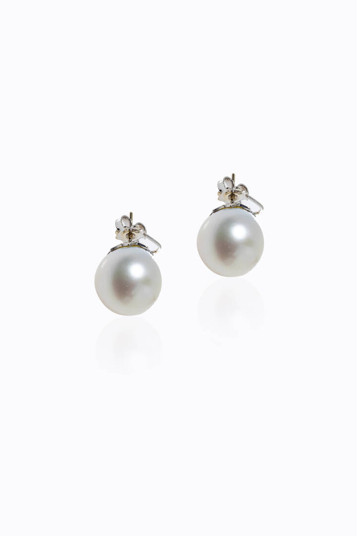 in oro bianco, a lobo, con due perle australiane del diam. di mm 14,5 e 14,8