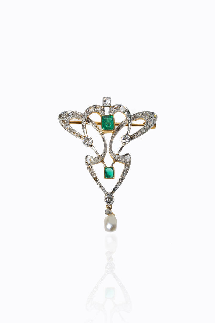 in oro giallo a bassa caratura ed argento, a voluta, inizi XX secolo, con smeraldi taglio baguette per totali ct 0,50 ca e diamanti taglio brillante di vecchio e rosette per totali ct 0,85 ca. Una perlina pendente