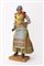 occhi di vetro, copricapo in creta, corpetto multicolore, maniche rette da fiocchi rossi, ampia gonna beige, zinale azzurro con ricche decorazioni ricamate