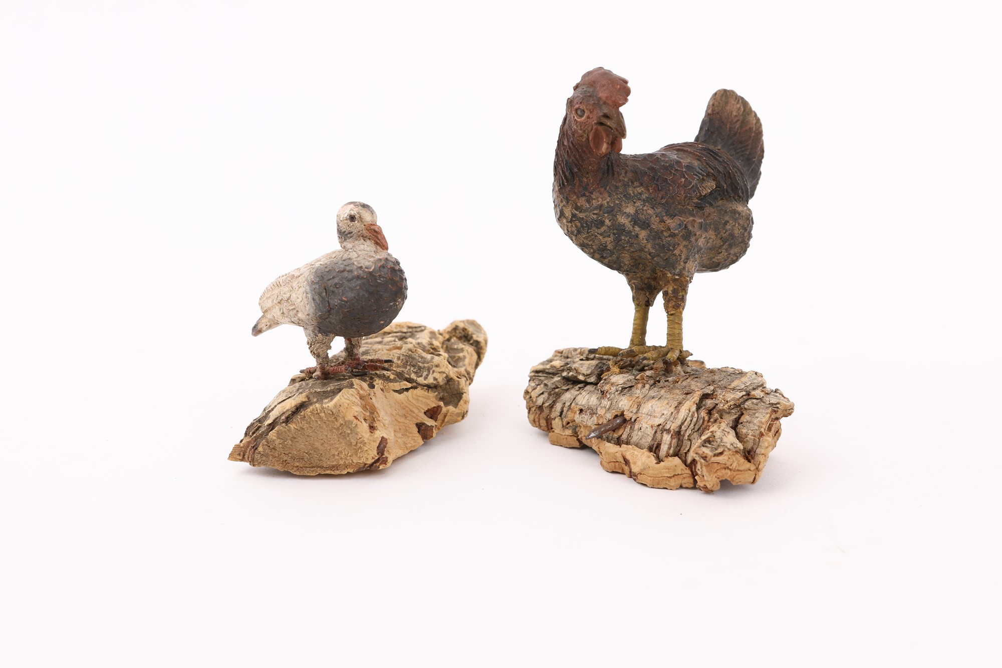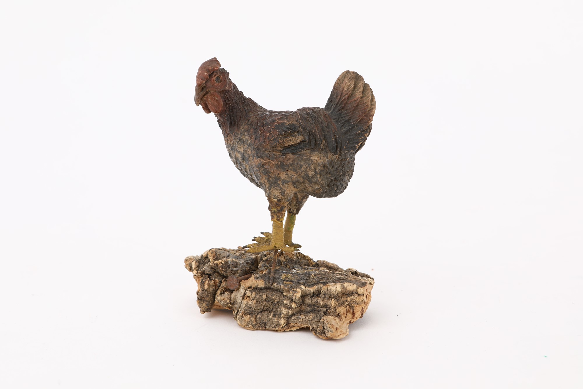 Gallinella e piccione in terracotta policroma occhi di vetro, zampe in ferro....