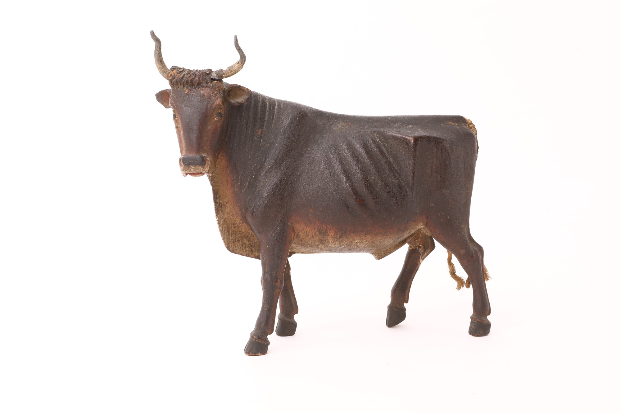 Toro in legno policromo, Sicilia, XIX secolo con coda di corda. Lievi difetti...