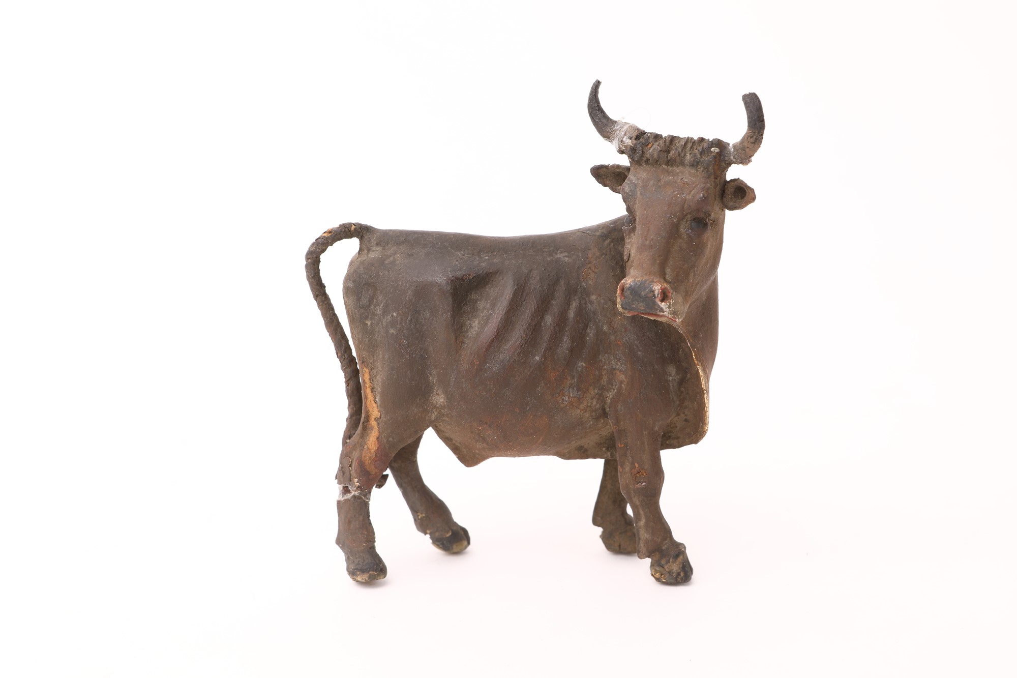 Toro in legno dipinto con coda in corda, Sicilia, XIX secolo cm 11x9x3