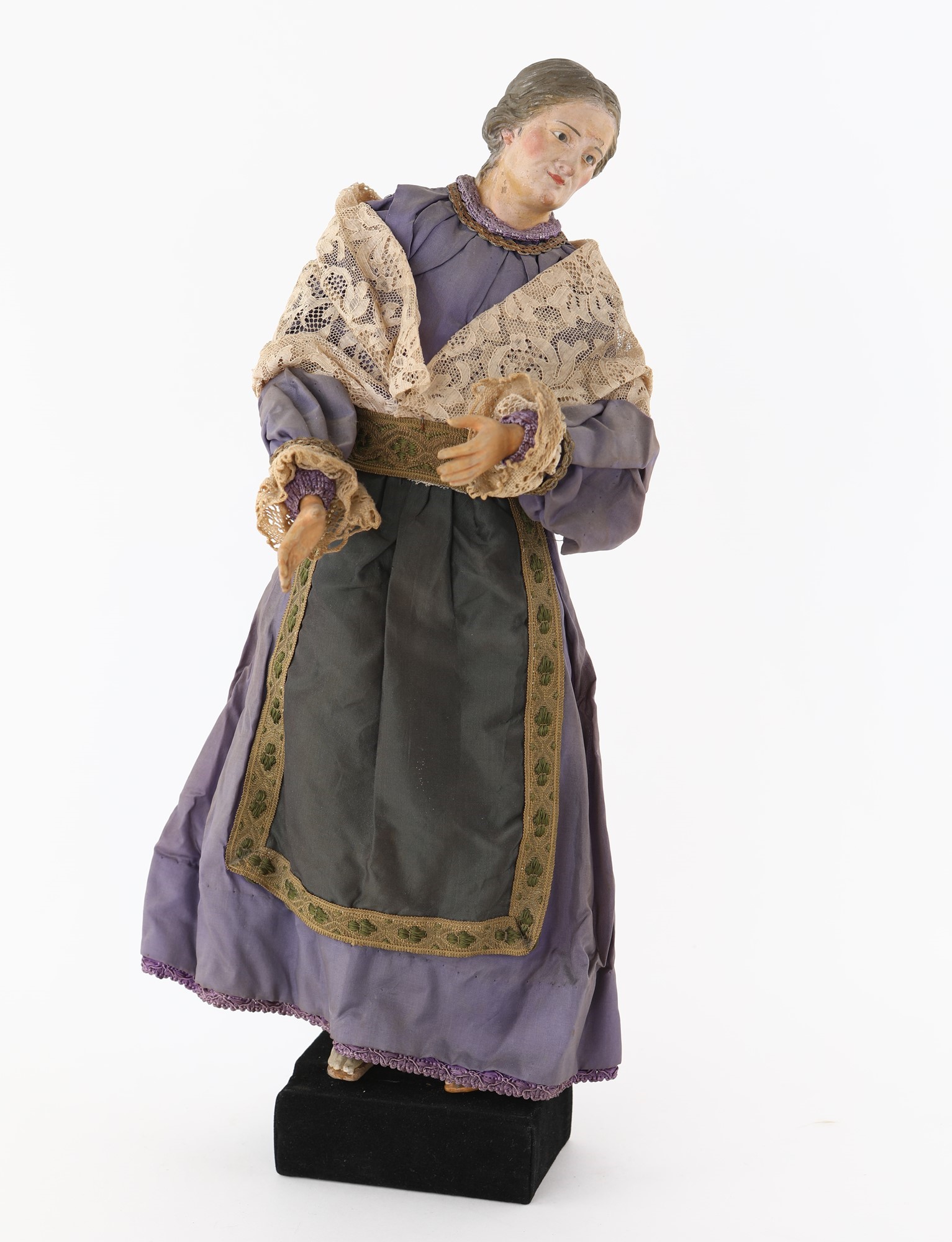 Donna anziana con chignon e scialle di merletto abito in seta viola e zinale...