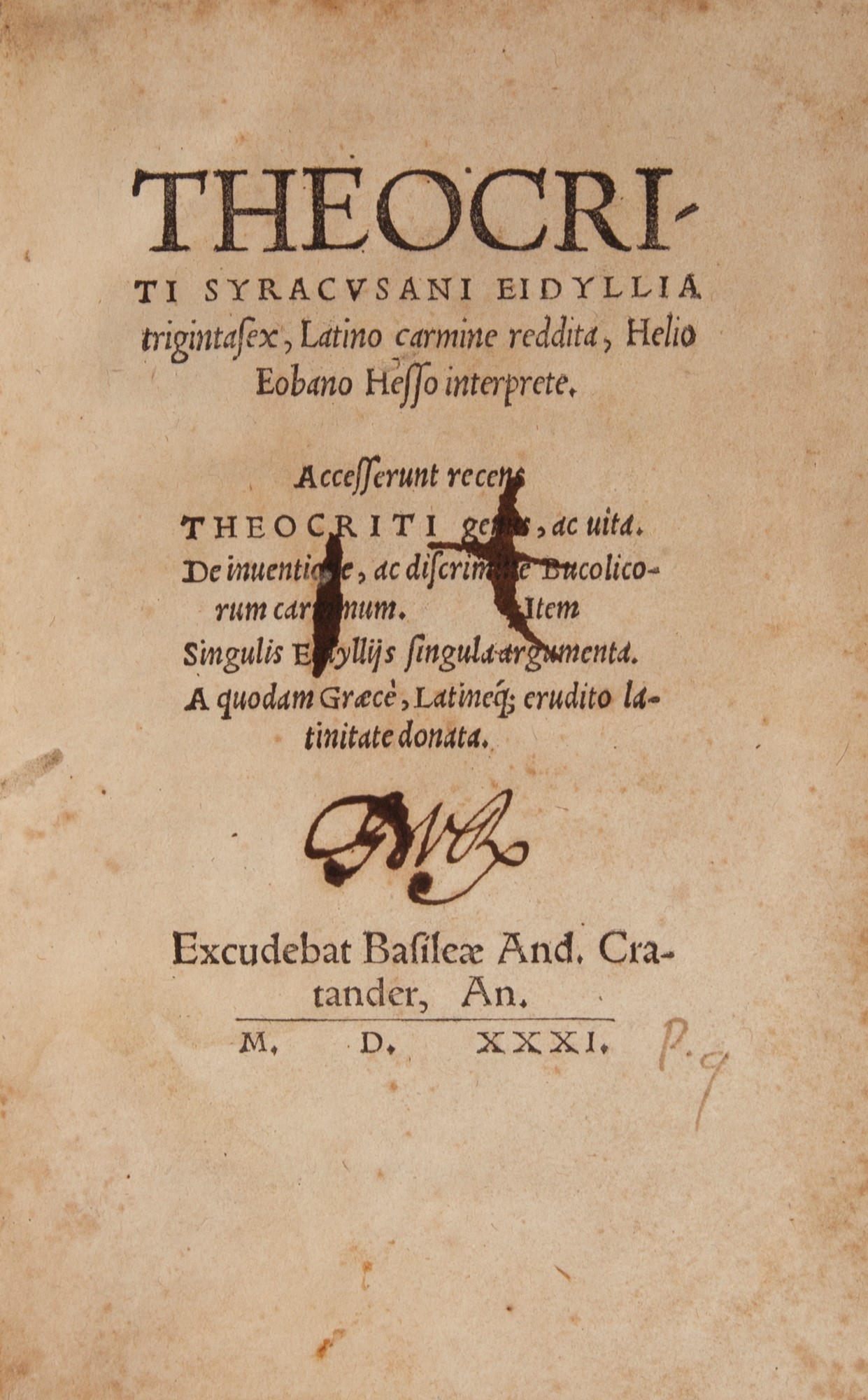 In 16°. Testo in latino degli idilli di Teocrito nella traduzione dell'umanista tedesco Hessus, giurista e medico, celebre per la perfezione delle sue poesie neolatine. Legatura in pergamena coeva rigida, titolo manoscritto al dorso, tagli color verde; foro di tarlo al frontespizio che non lede il testo.