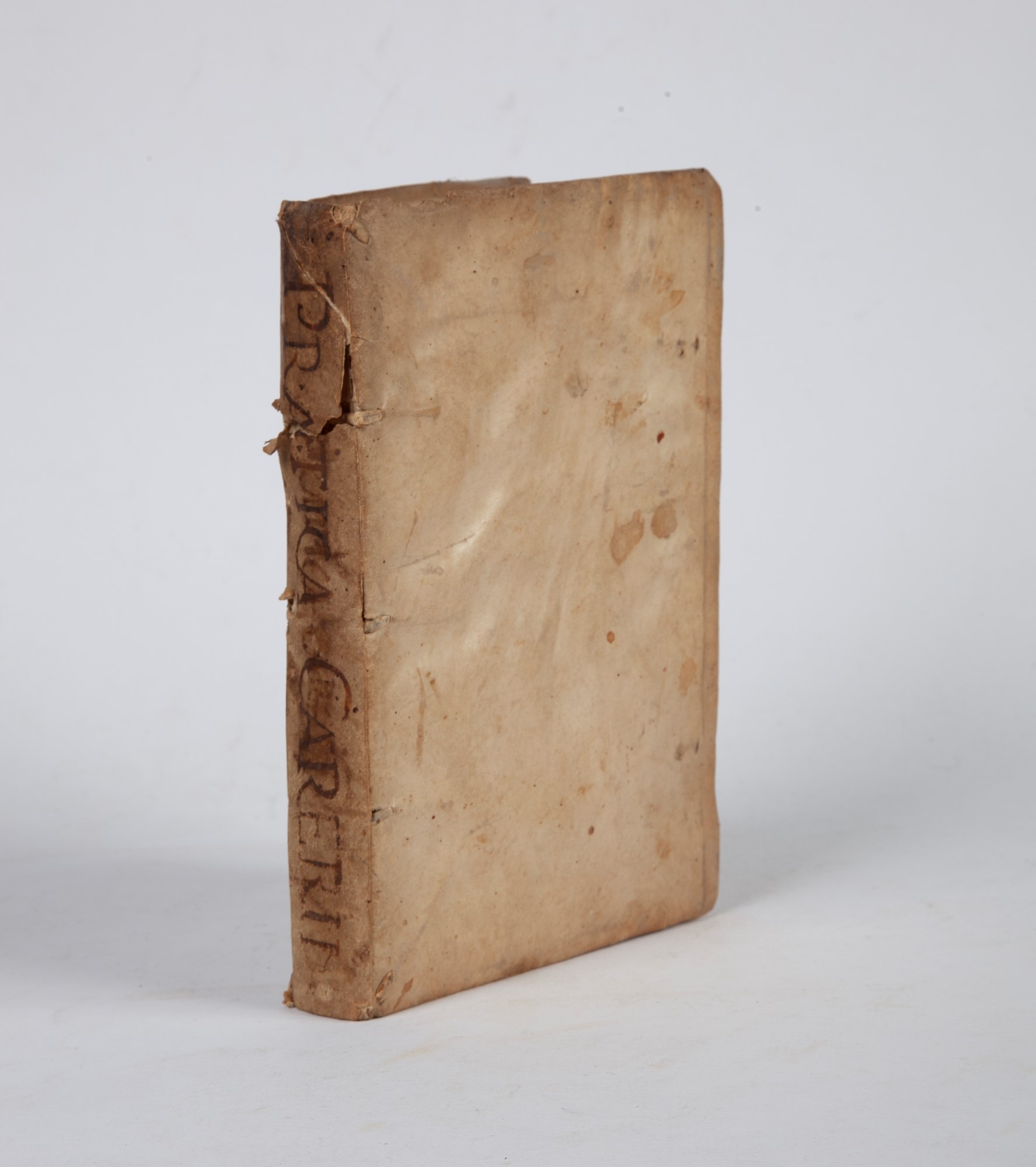 In 8° piccolo Edizione veneziana illustrata, successiva a quella del 1548 (la prima Napoli 1546) dell'opera giuridica dell'avvocato e giurista calabrese, nella quale si tratta ampiamente degli eretici, delle streghe e della stregoneria nonché delle pene per i loro crimini, compresa la tortura. Piena pergamena coeva con titolo manoscritto al dorso.