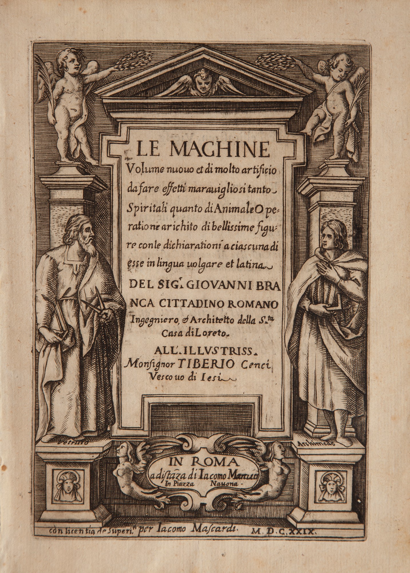 Giovanni Branca. Le machine. Volume nuovo et di molto artificio da fare effetti maravigliosi tanto Spiritali quanto di Animale Operatione arichito di bellissime figure con le dichiarationi a ciascuna di esse in lingua volgare et latina