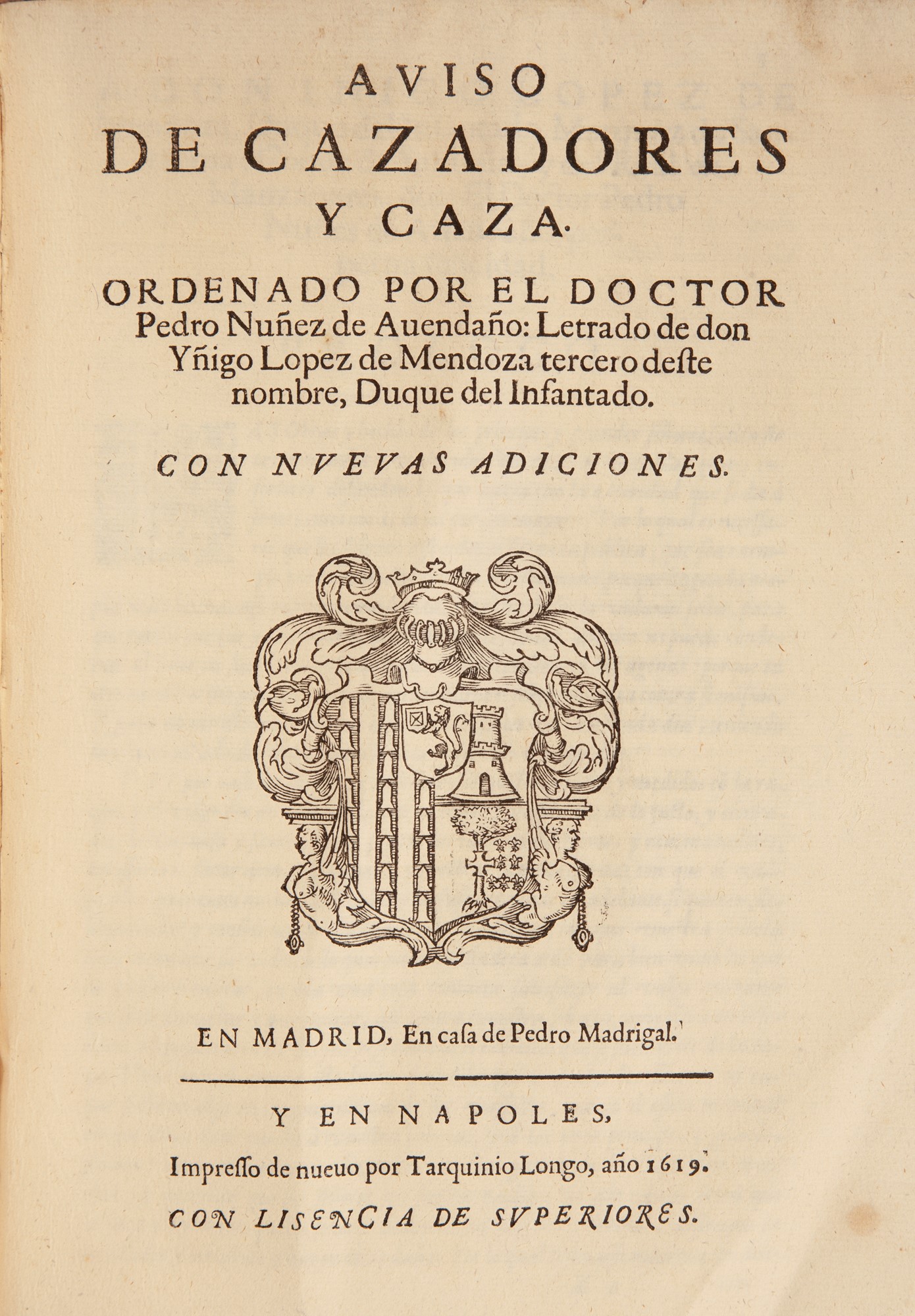 In 4°. Prima edizione italiana di questo rarissimo trattato sui cacciatori e la caccia del famoso giureconsulto spagnolo. Come di sovente unito con: Pedro Nuñez de Avendaño. De exequendis mandatis regum Hispaniae - Tarquinio Longo, Napoli 1620. Edizione italiana dell'originale cinquecentesco spagnolo. Opera di diritto pubblico: costituzionale, criminale, amministrativo, importante per la conoscenza della legge spagnola nelle colonie del nuovo mondo. Legatura in piena pergamena coeva, titolo manoscritto al dorso.