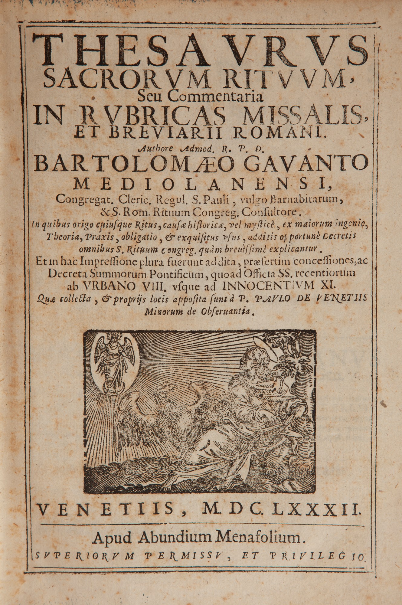 In 8° Quattro opere ognuna col proprio frontespizio in cinque parti legate in un volume. Opera del barnabita milanese nella quale vengono tracciate le origini storiche dei sacri riti ed i loro significati mitici e vengono delineate le osservanze e gli obblighi. Sono aggiunti decreti e prassi fino al pontificato di Innocenzo XI in questa edizione veneziana ampliata dal barnabita Paolo da Venezia. Legatura in piena pergamena con 5 nervi e titolo manoscritto al dorso. Tagli spruzzati.