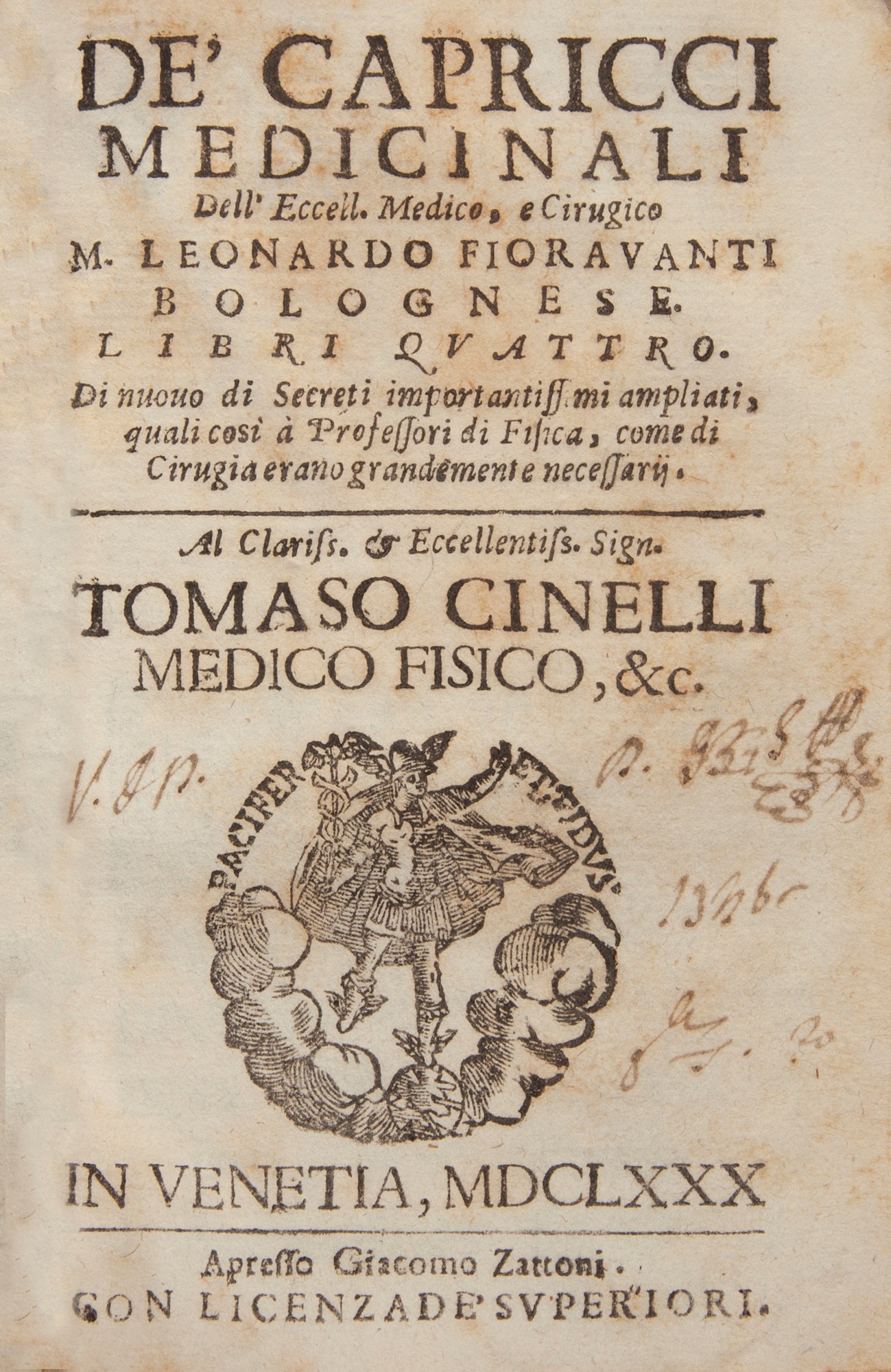 Leonardo Fioravanti. De' capricci medicinali Libri quattro. Di nuovo di Secreti importantissimi ampliati, quali così a Professori di Fisica, come di Cirugia erano grandemente necessarii