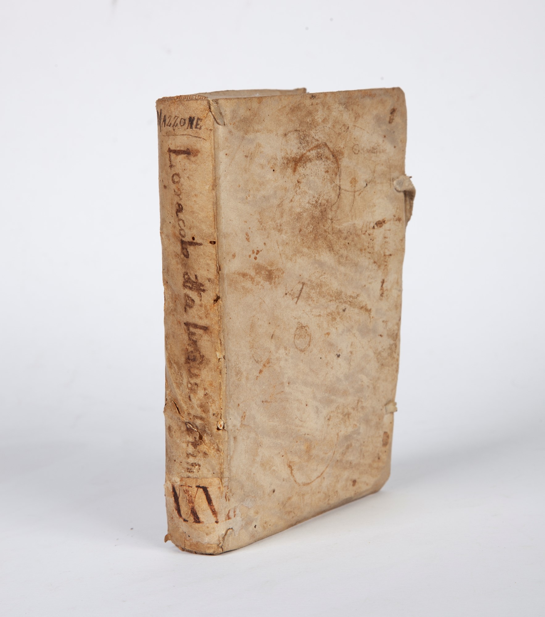In 16°. Interessante manuale per l'uso dei motti latini con traduzione italiana su svariati argomenti, dal diavolo all'astrologo, al soldato, al cacciatore, agli sbirri, sul gioco dei dadi, sugli uccelli e sul loro canto. Legatura in piena pergamena coeva con legacci, titolo manoscritto al dorso. Lievi lavori di tarlo che non ledono il testo e lievi gore d'acqua in alcune carte.