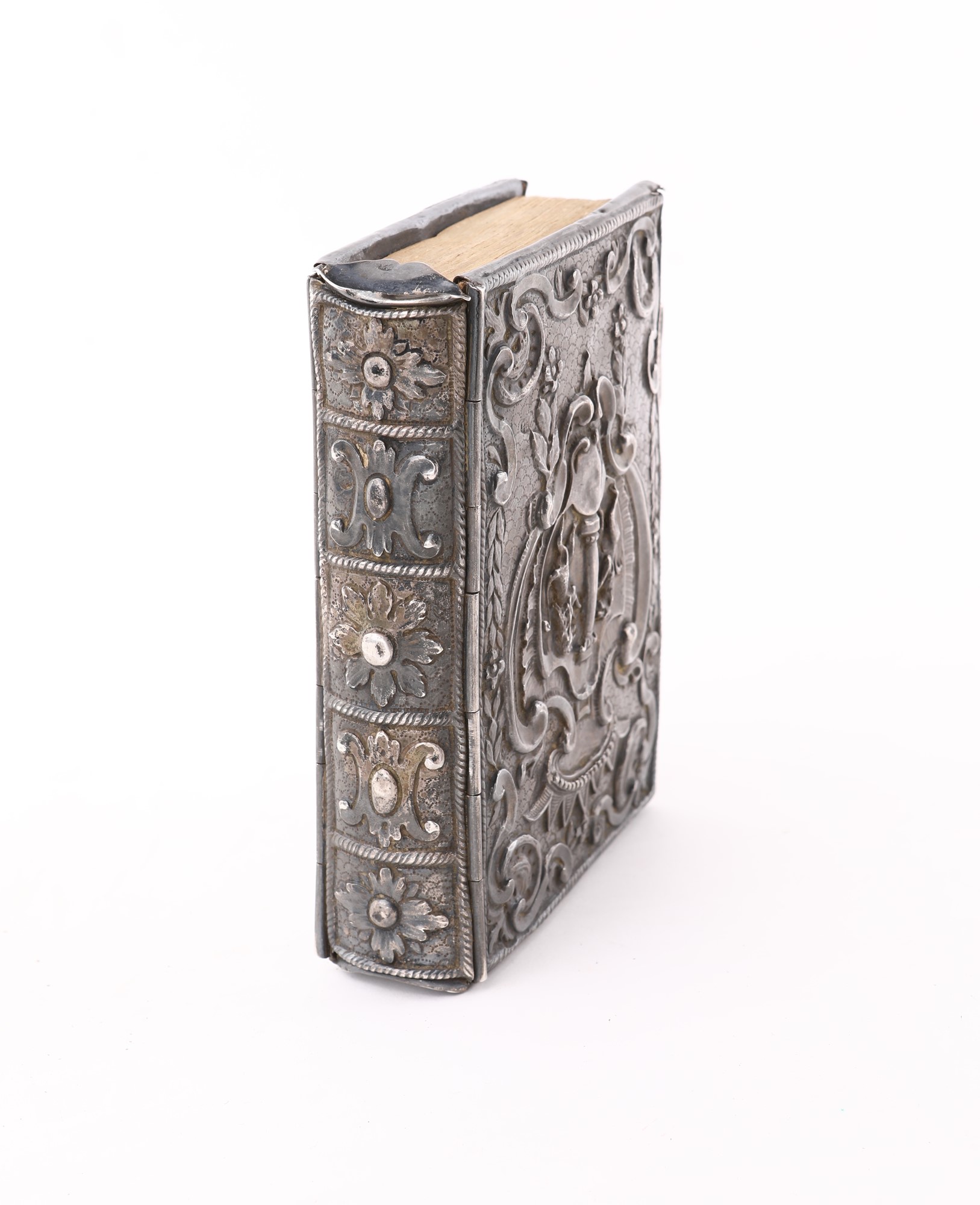 In 16° Con legatura in argento sbalzato. Piatti caratterizzati da stemma araldico con colonna centrale affiancata da leoni rampanti, dominato da corona baronale; tutt'intorno si dispongono volute e cascatelle con fiori. Dorso a cinque caselle delimitate da nervi; sguardie in seta. Mancante una fermezza.