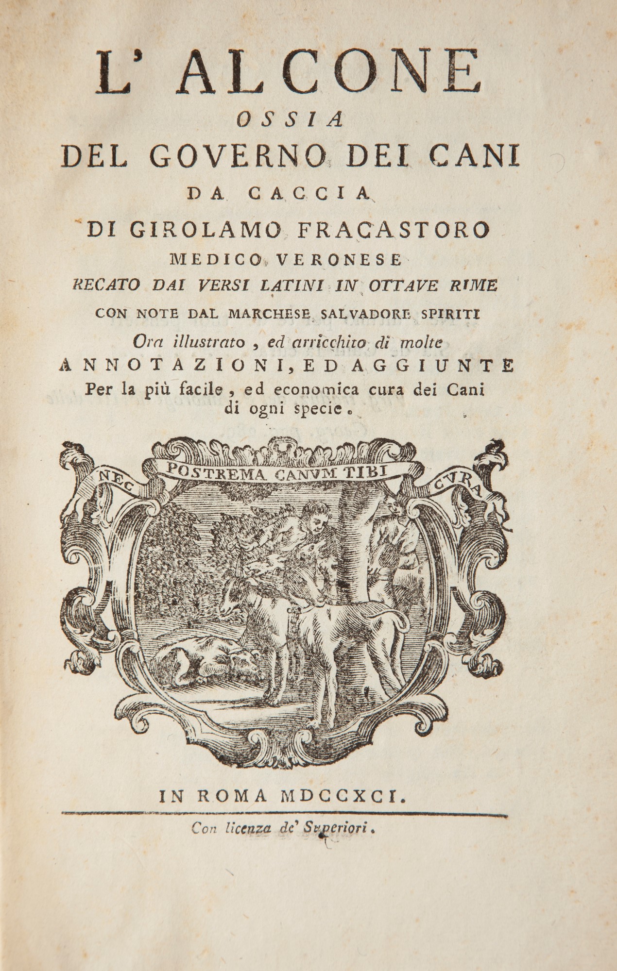 In 8°. Seconda edizione italiana nella versione del marchese Salvadore Spiriti. La prima in latino del 1577. Interessante trattato sul governo dei cani da caccia nel dialogo fittizio in versi tra il vecchio Maestro Alcone e l'allievo Acasti sulle varie razze dei cani da caccia, le loro malattie e i metodi per guarirli. Legatura in piena pergamena coeva, tassello in pelle al dorso con titolo in oro, tagli spruzzati.