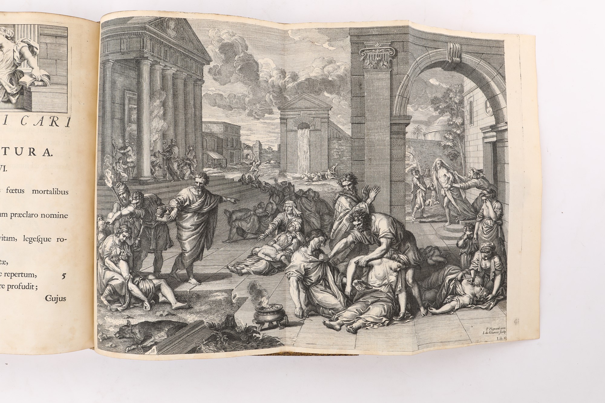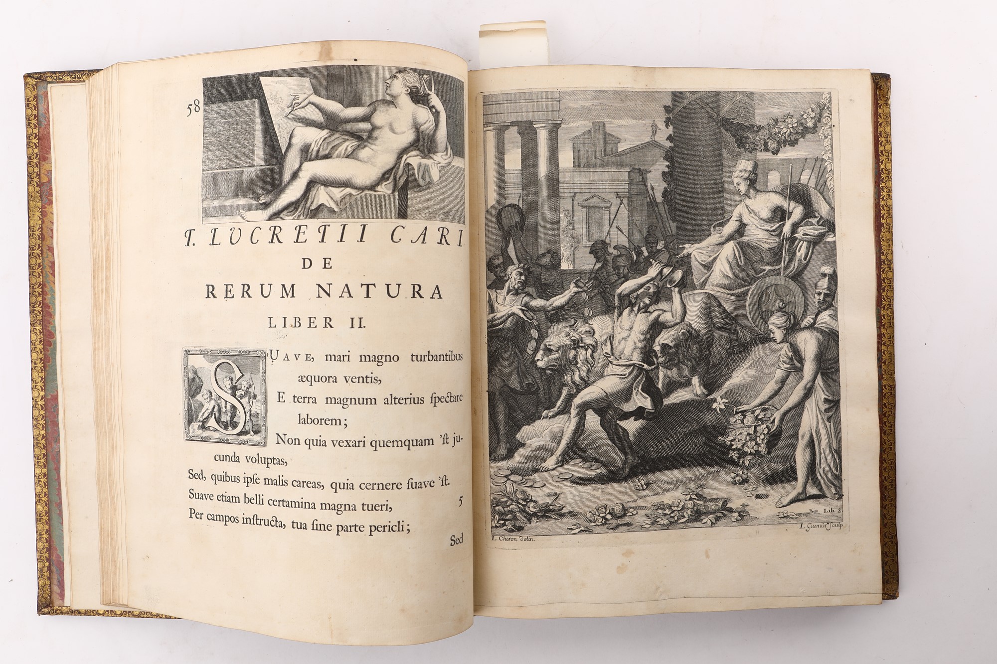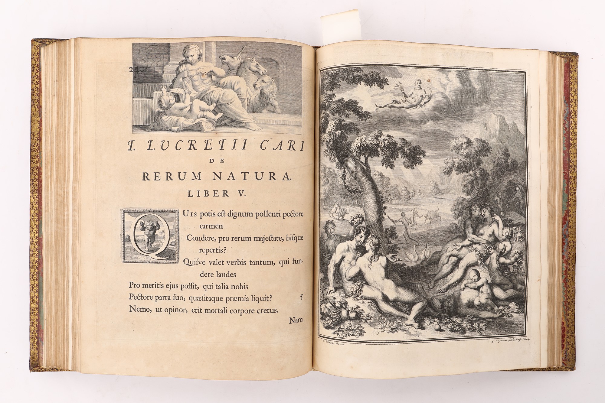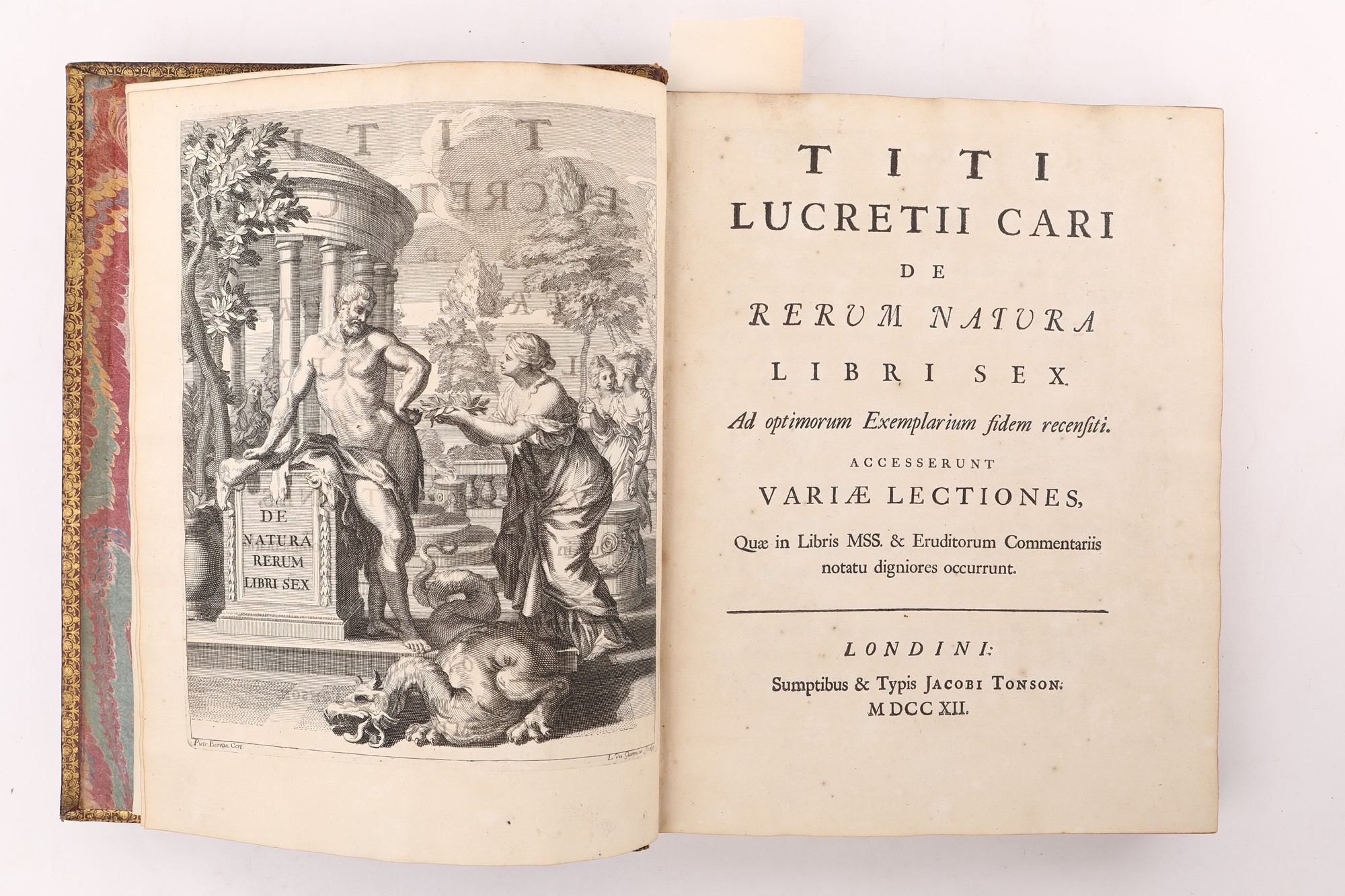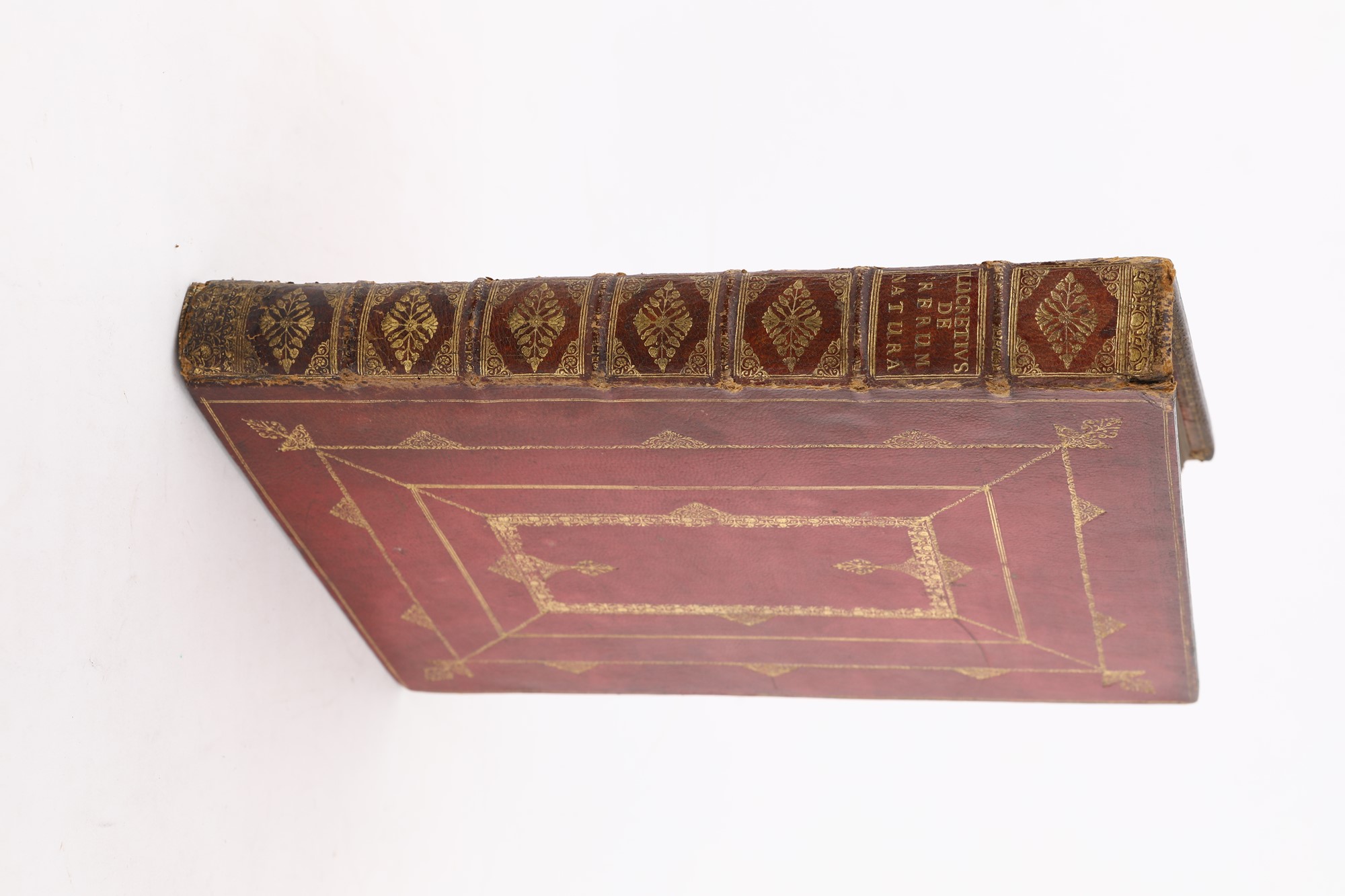 In 4° Frontespizio illustrato e 6 tavole a piena pagina e ripiegate. Testo in latino. Sei libri in versi esametri latini dell'unica opera sopravvissuta del poeta e filosofo romano Tito Lucrezio Caro, nella quale si tratta per la prima volta del mondo degli atomi. In secondo luogo si tratta dell'anima umana e per ultimo del cosmo nel suo insieme. Ogni argomento è trattato in due libri Piena pelle coeva con titoli e fregi in oro al dorso e fregi in oro ai piatti. Tagli dorati.