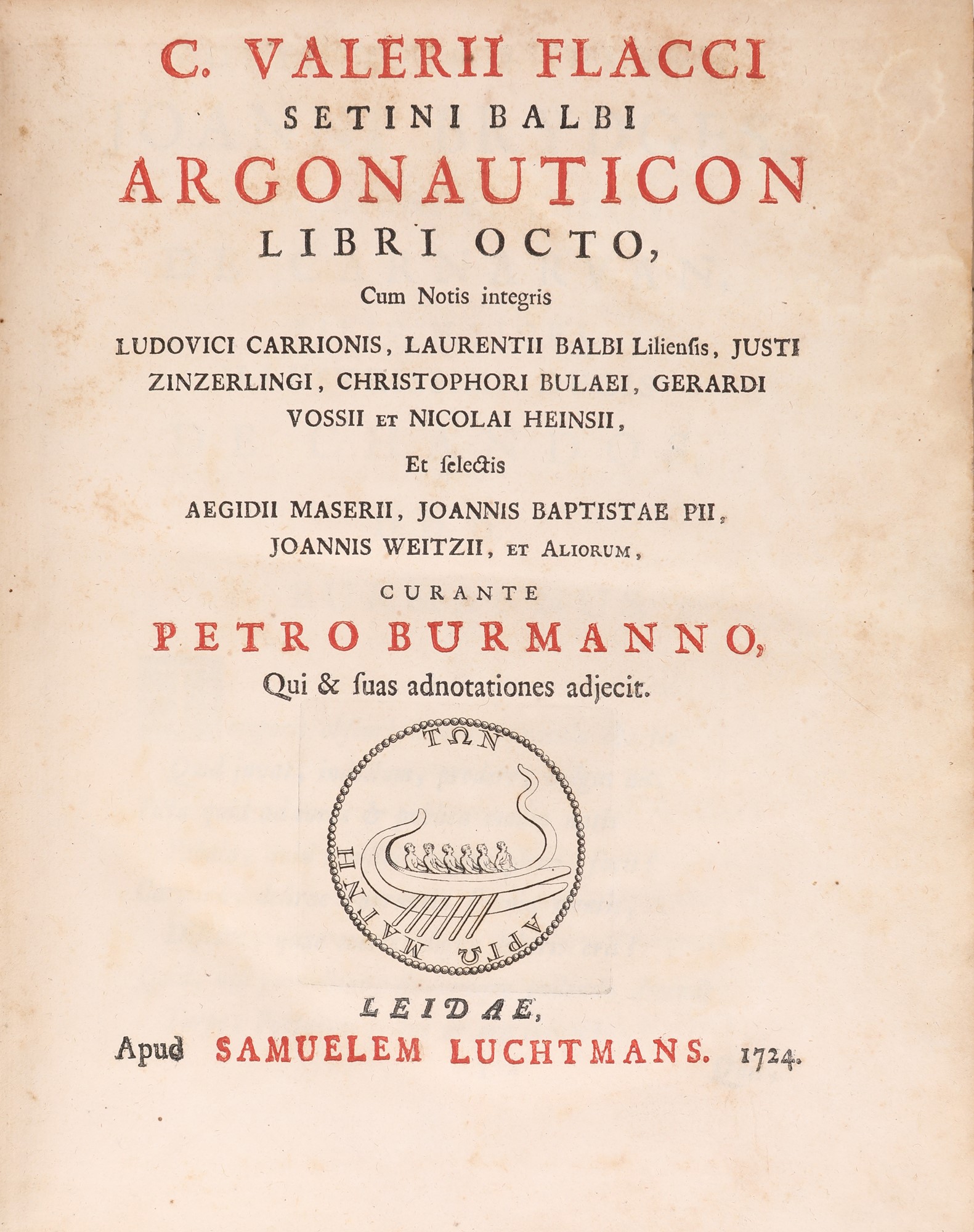 C. Valerii Flacci. Setini Balbi. Argonauticon Libri octo Cum notis integris Ludovici Carrionis, Laurentii Balbi Liliensis, Justi Zinzerlingi, Christophori Bulaei, Gerardi Vossii et Nicolai Heinsii, et selectis Aegidii Maserii, Joannis Baptistae Pii, Joannis Weitzii, et Aliorum, Curante Petro Burmanno