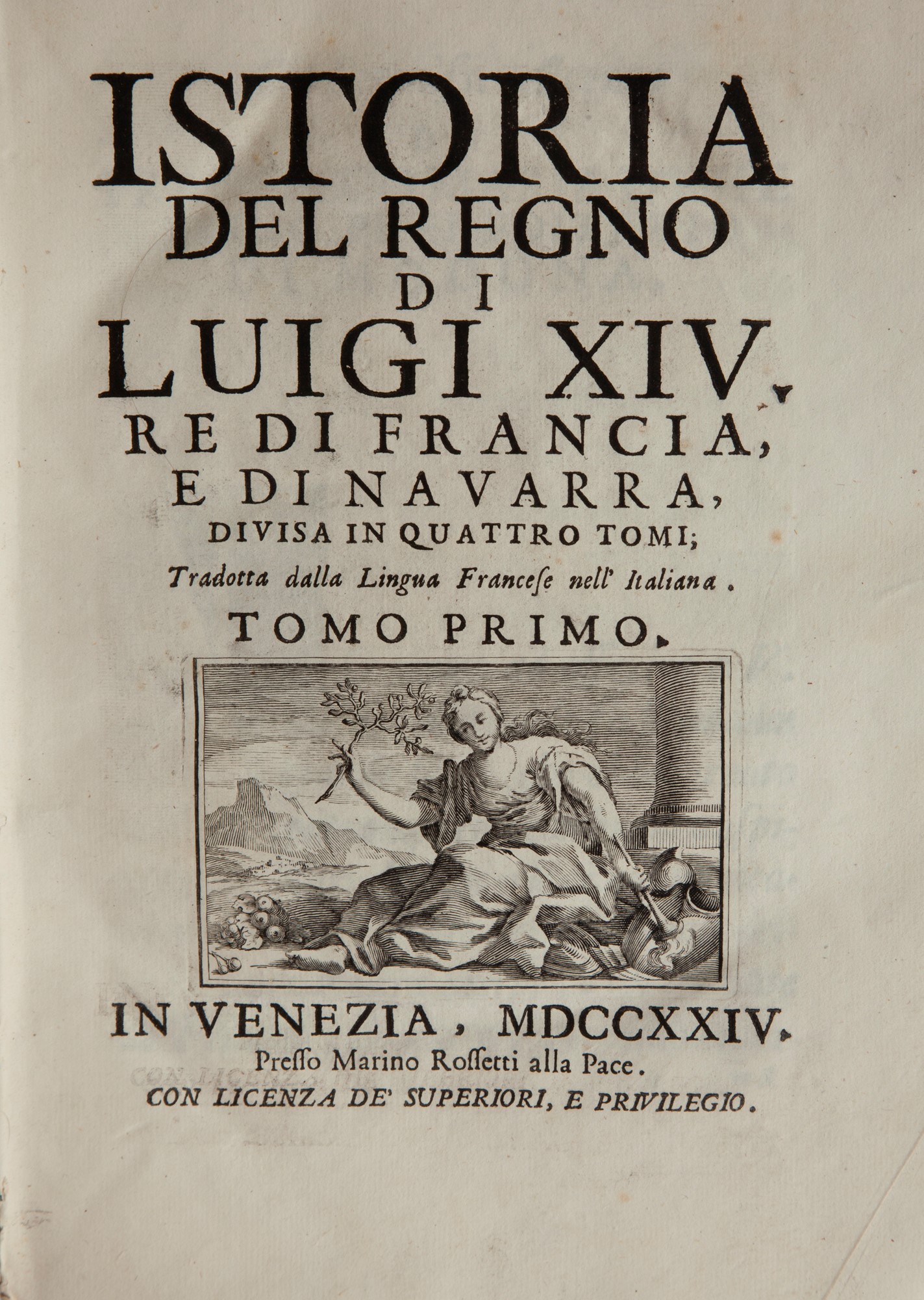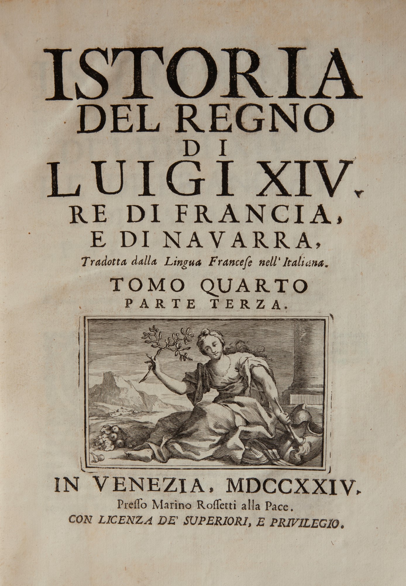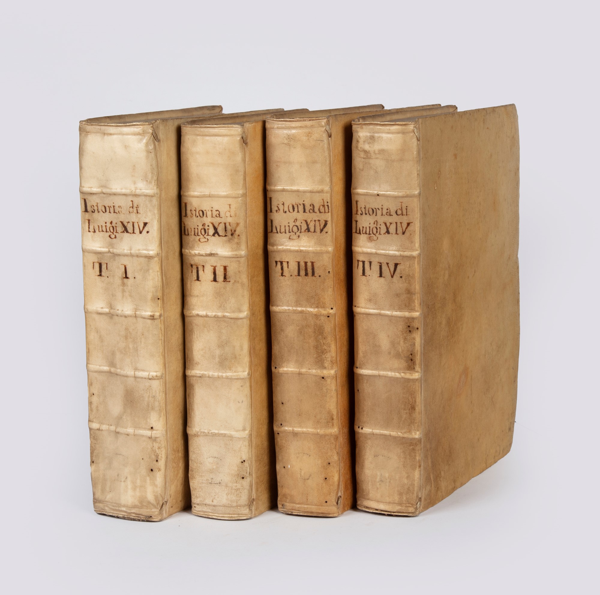 In 8° Completo in 4 volumi Traduzione italiana della Storia del regno di Francia dal 1651, col passare alla maggiore età di Luigi XIV fino alla sua Consacrazione nel 1654 per concludere cogli eventi successivi alla pace col Duca di Savoia nel 1696 e alla fine del Regno. Ritratto inciso in rame da A. Zuliani all'antiporta del tomo I. Legature in piena pergamena coeva a 5 nervi con titolo manoscritto ai dorsi.