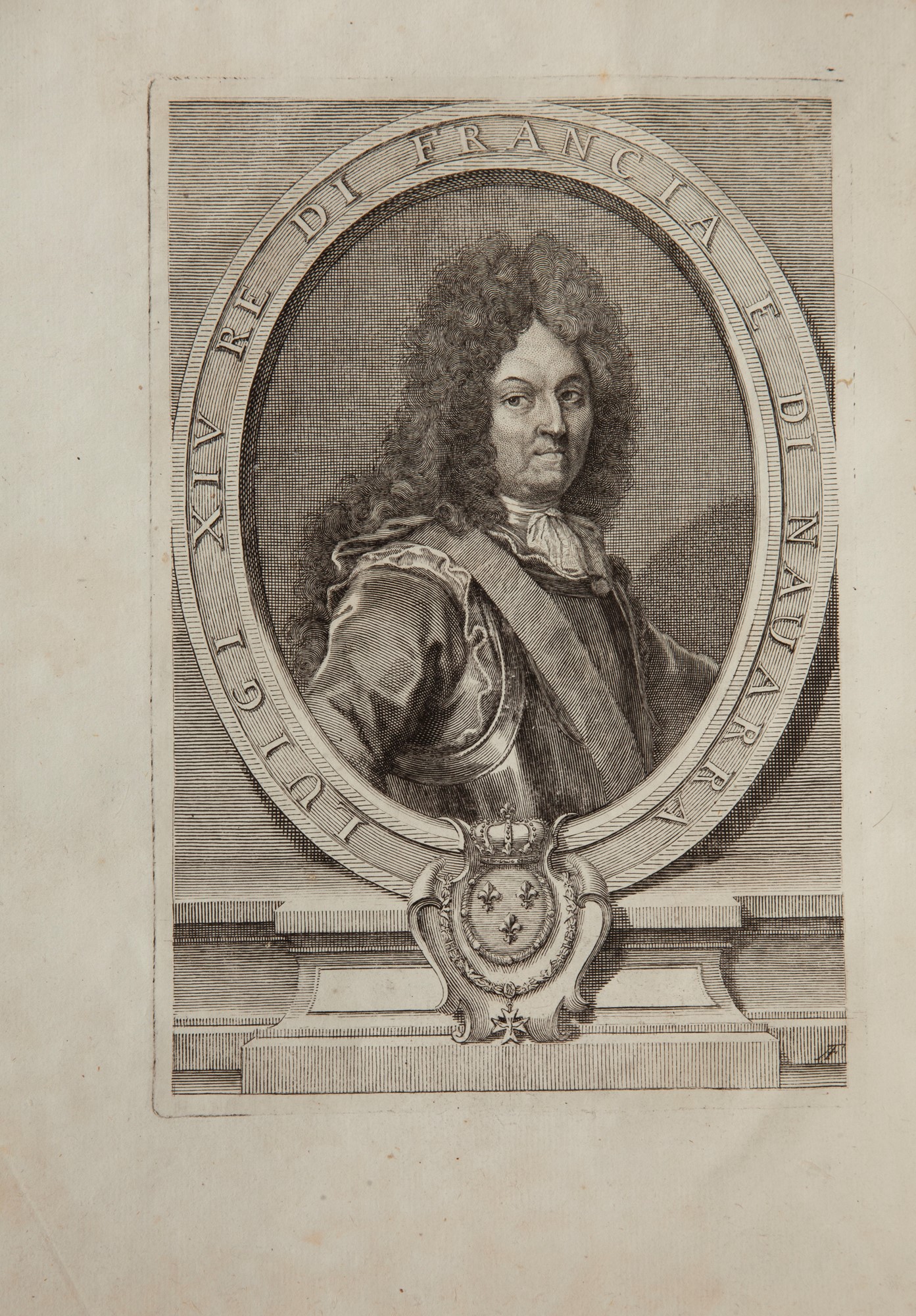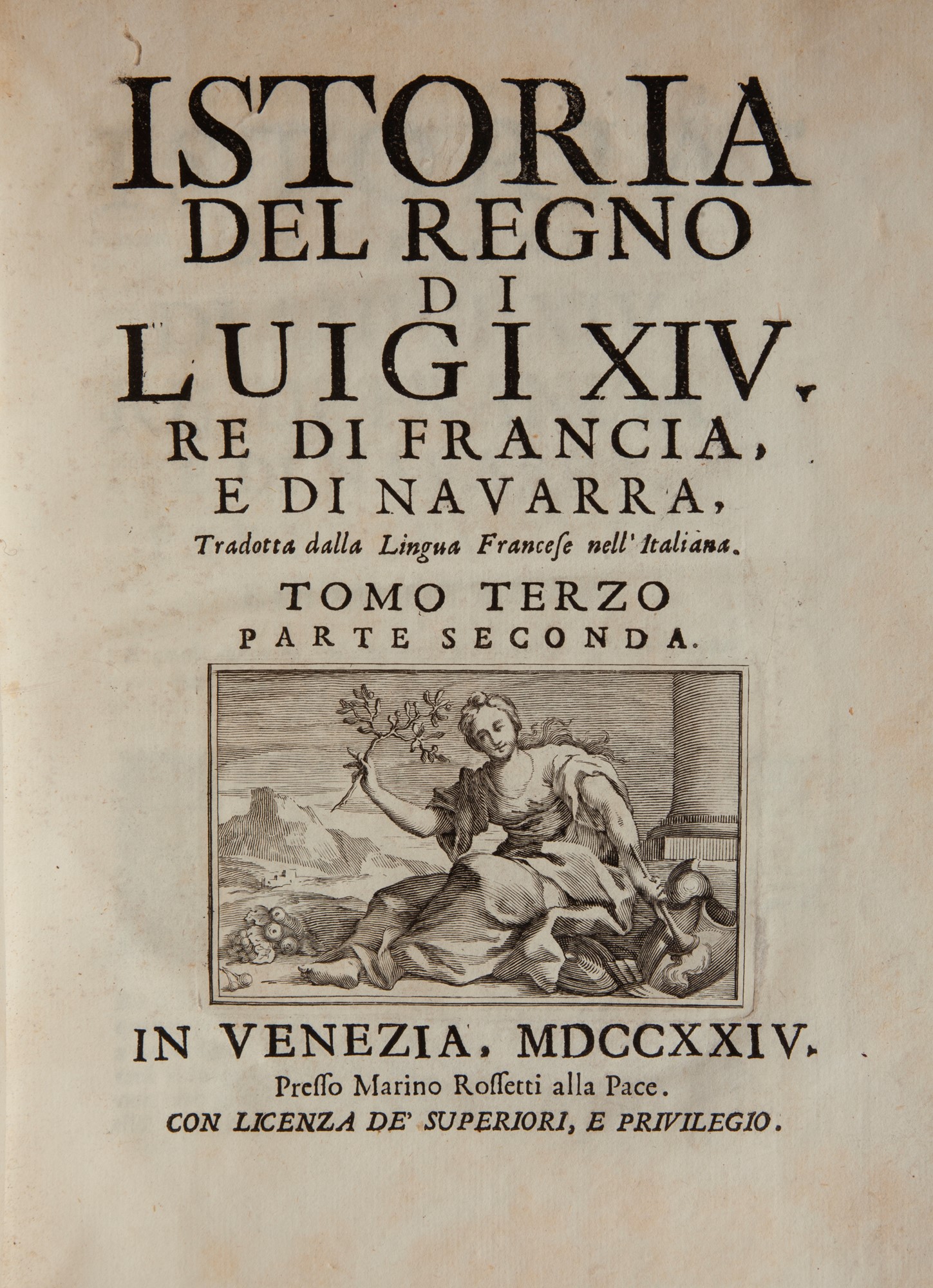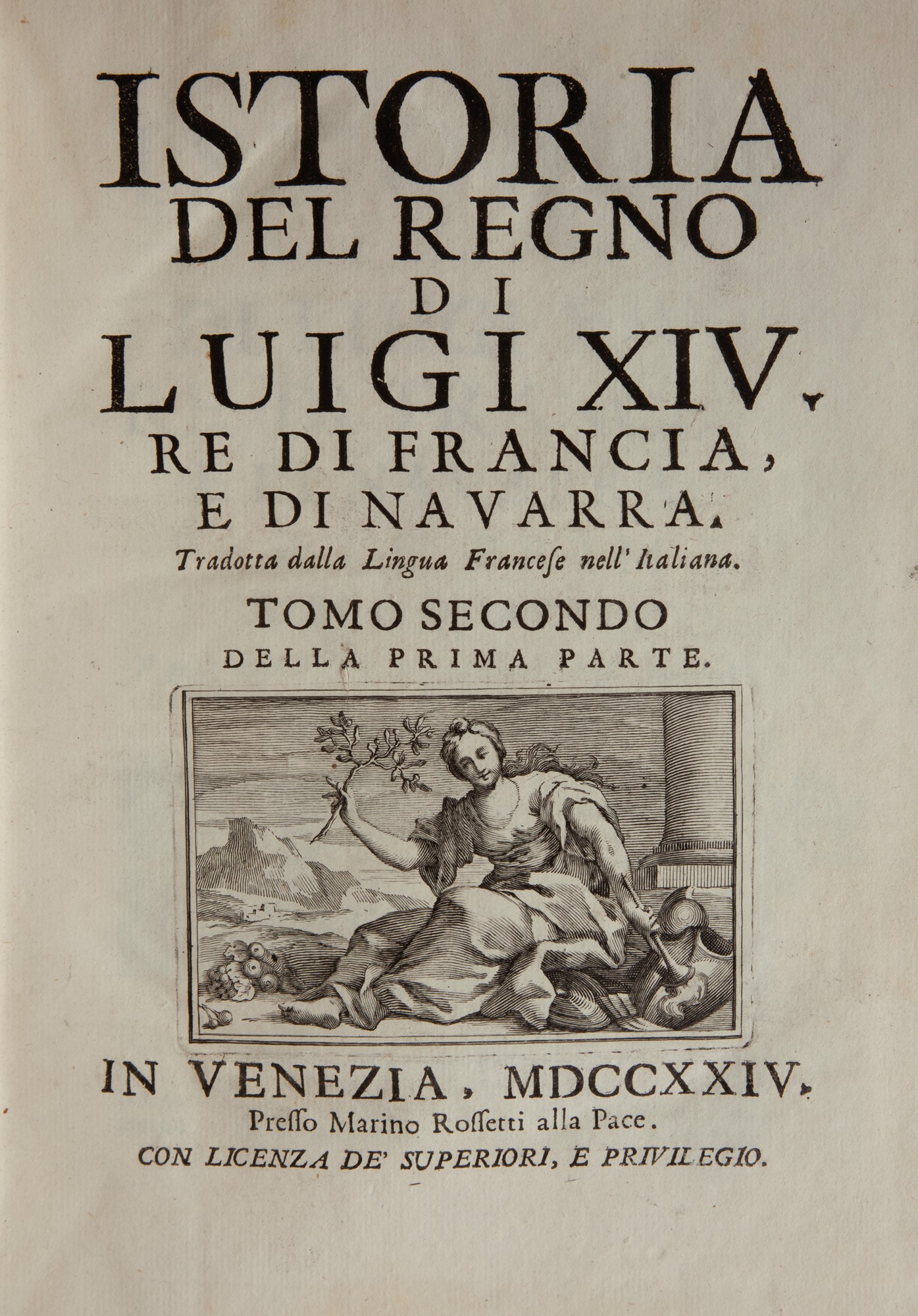 In 8° Completo in 4 volumi Traduzione italiana della Storia del regno di Francia dal 1651, col passare alla maggiore età di Luigi XIV fino alla sua Consacrazione nel 1654 per concludere cogli eventi successivi alla pace col Duca di Savoia nel 1696 e alla fine del Regno. Ritratto inciso in rame da A. Zuliani all'antiporta del tomo I. Legature in piena pergamena coeva a 5 nervi con titolo manoscritto ai dorsi.