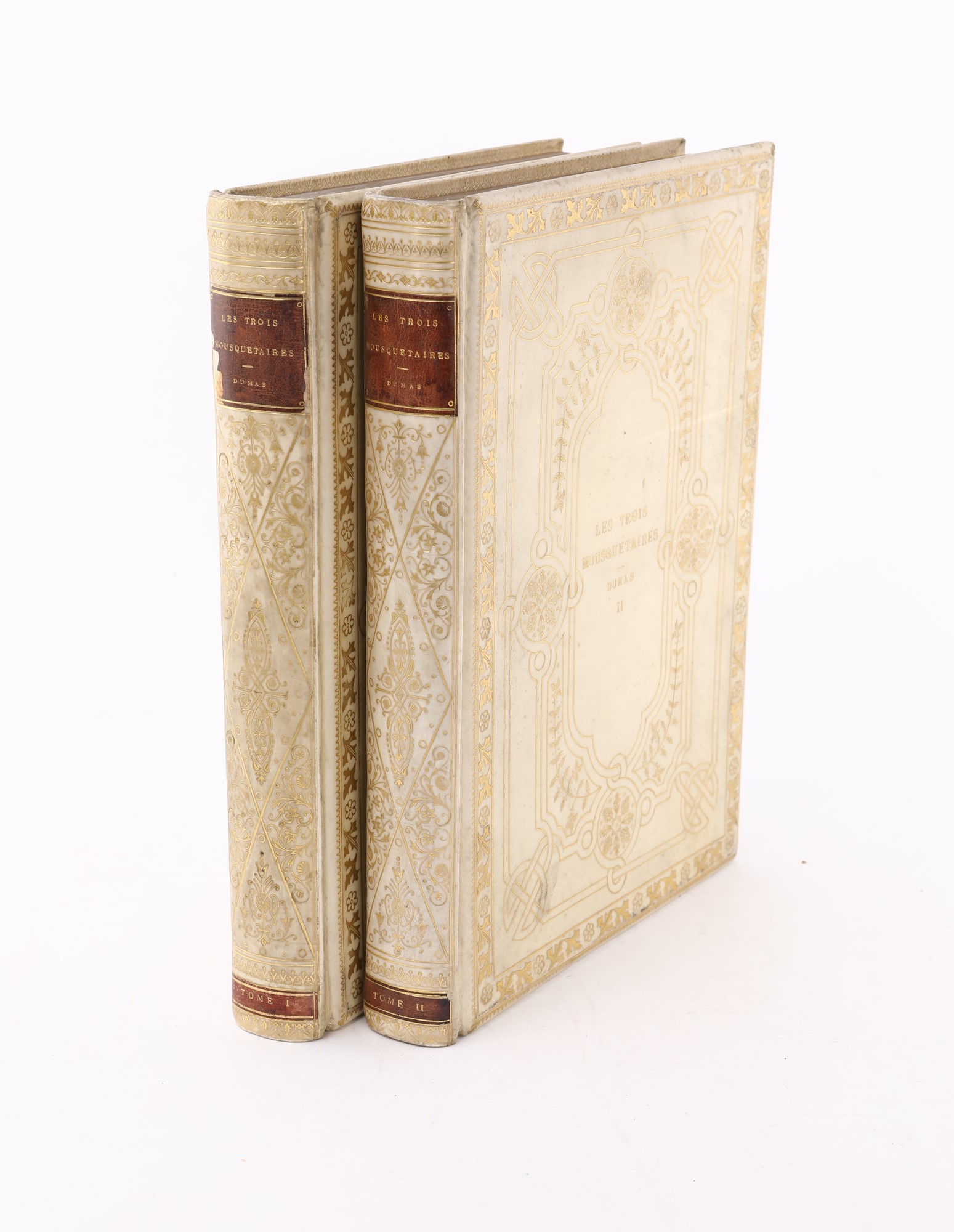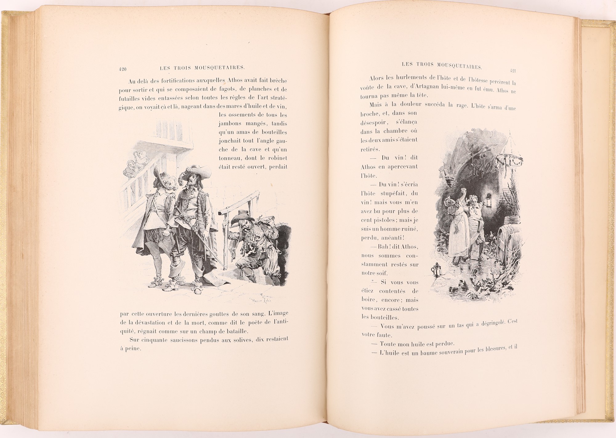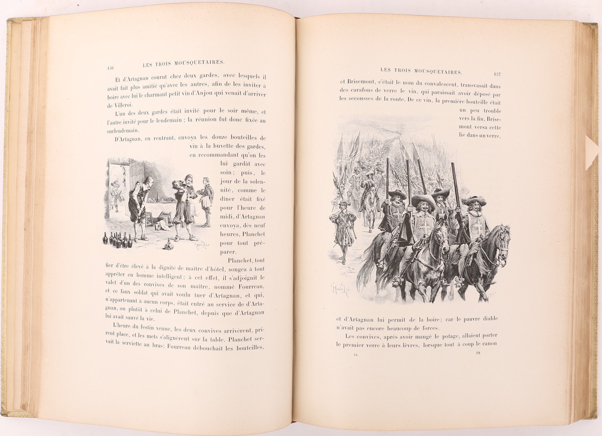 In 4° 2 Volumi. Edizione riccamente illustrata del romanzo scritto nel 1844 da Alexandre Dumas, con 245 incisioni nel testo su disegni di Maurice Leloir realizzate da Jules Huyot. Splendide legature in piena pergamena coeva firmate E. Worrall - Binder - Birmingham, con titoli e fregi in oro ai piatti e fregi dorati ai dorsi; tasselli in pelle con titoli in oro ai dorsi e taglio superiore dorato.