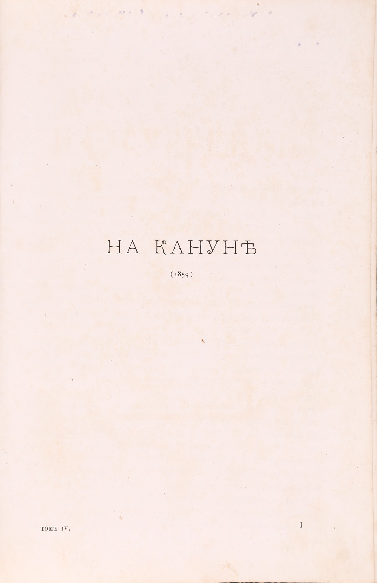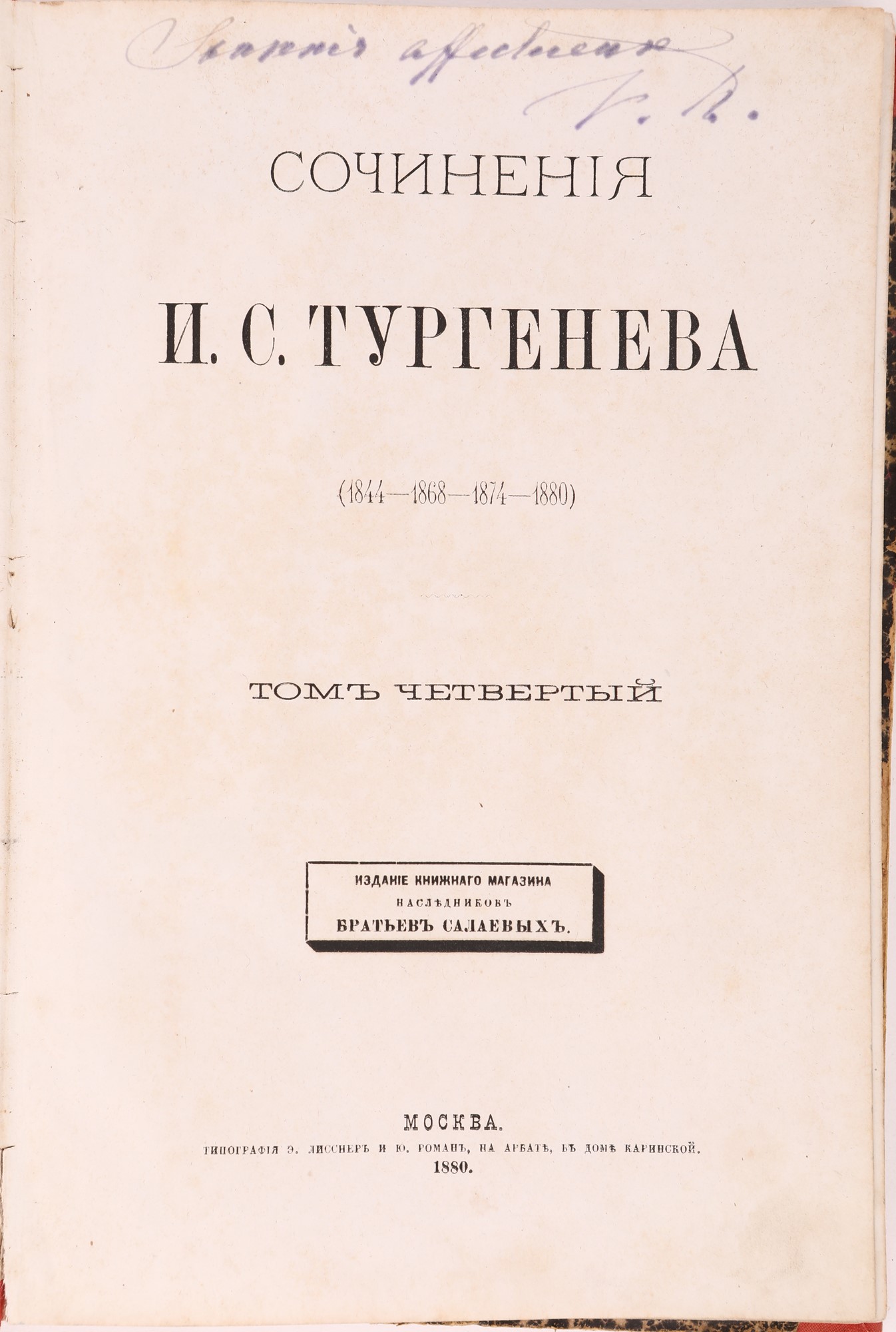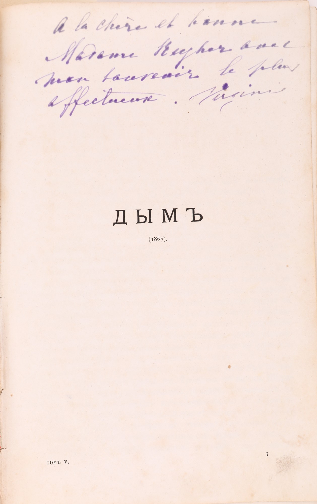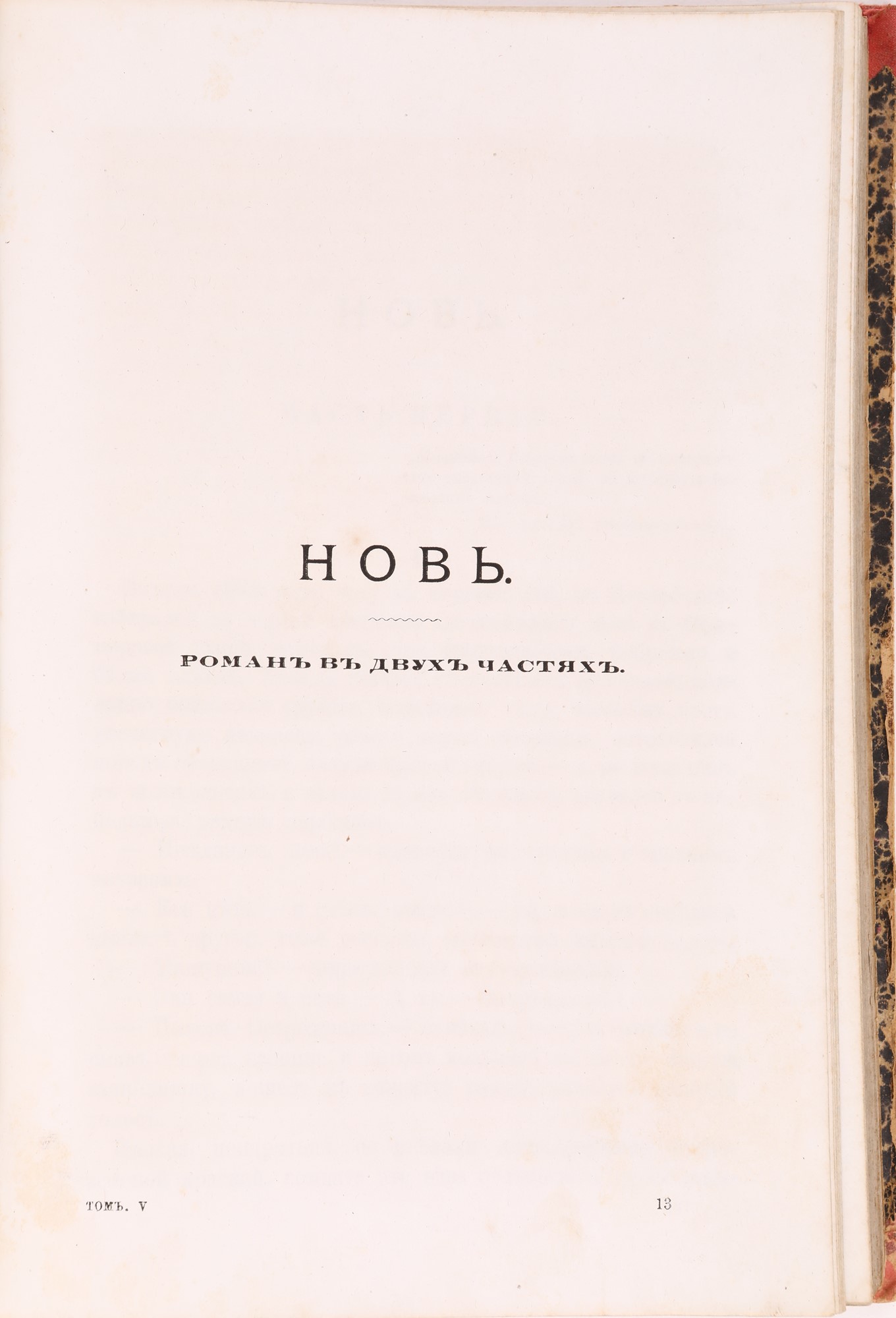 In 8°. Solo 2 Volumi: Tomo quarto con "Alla Vigilia" del 1859 e "Padri e figli" del 1861, e Tomo quinto con "Fumo" del 1867 e "Terra Vergine" del 1877. Edizione della raccolta delle opere del celebre scrittore e drammaturgo russo stampata ancora in vita. Legatura in mezza tela coeva (difetti).
