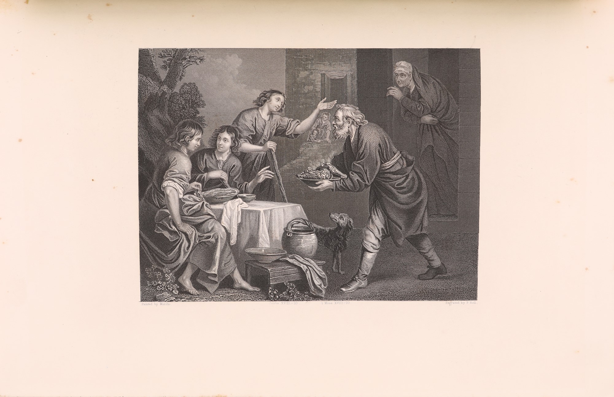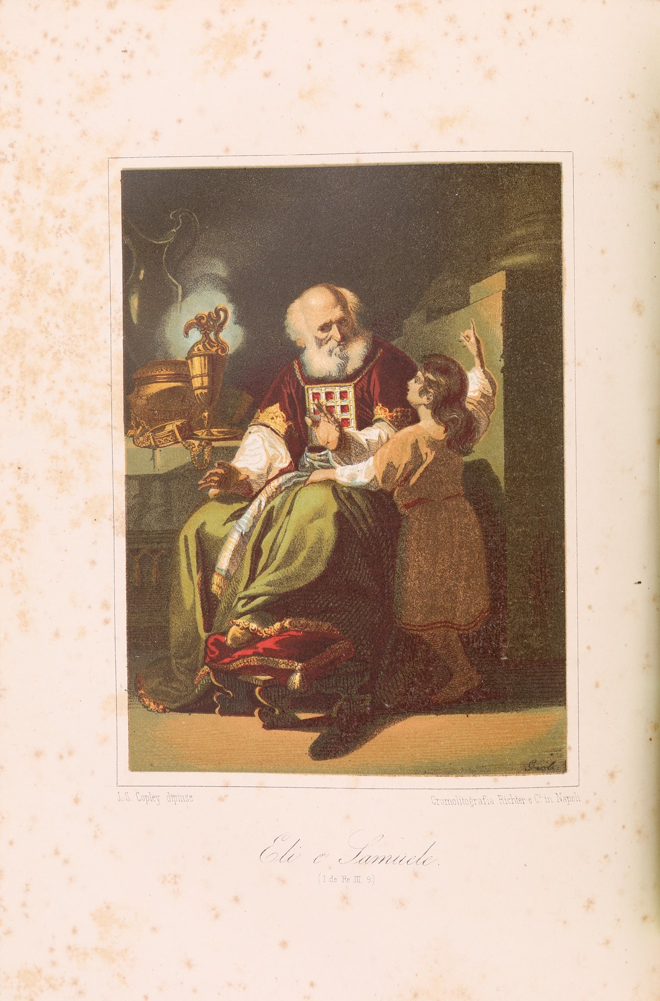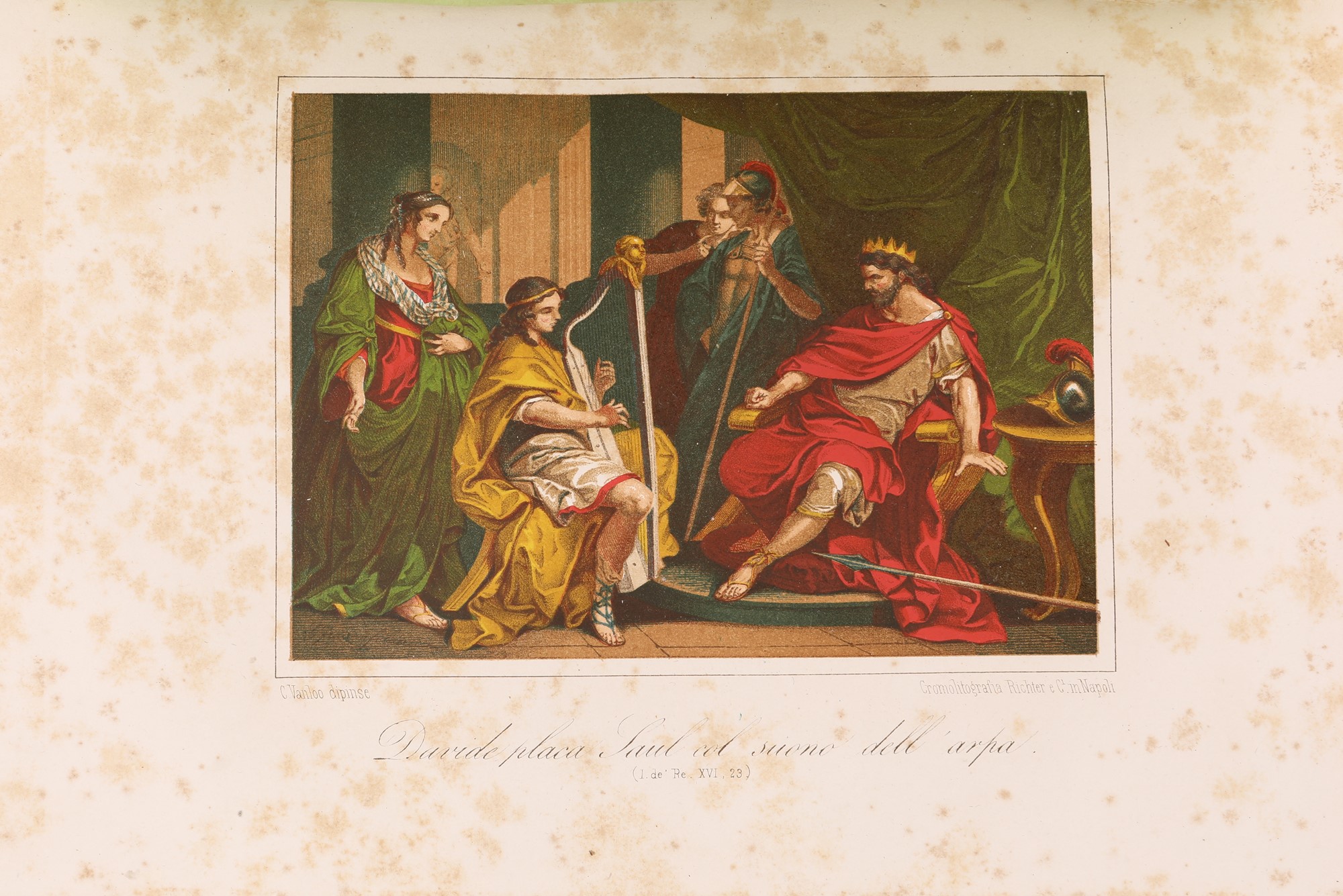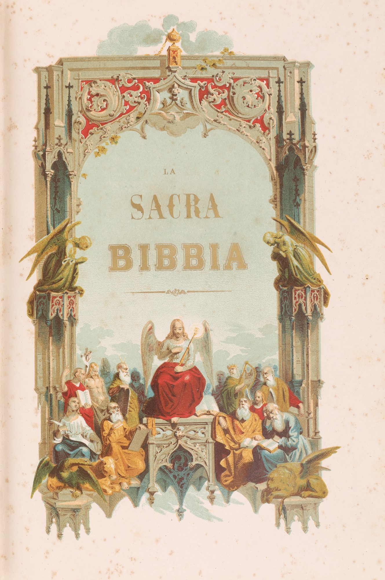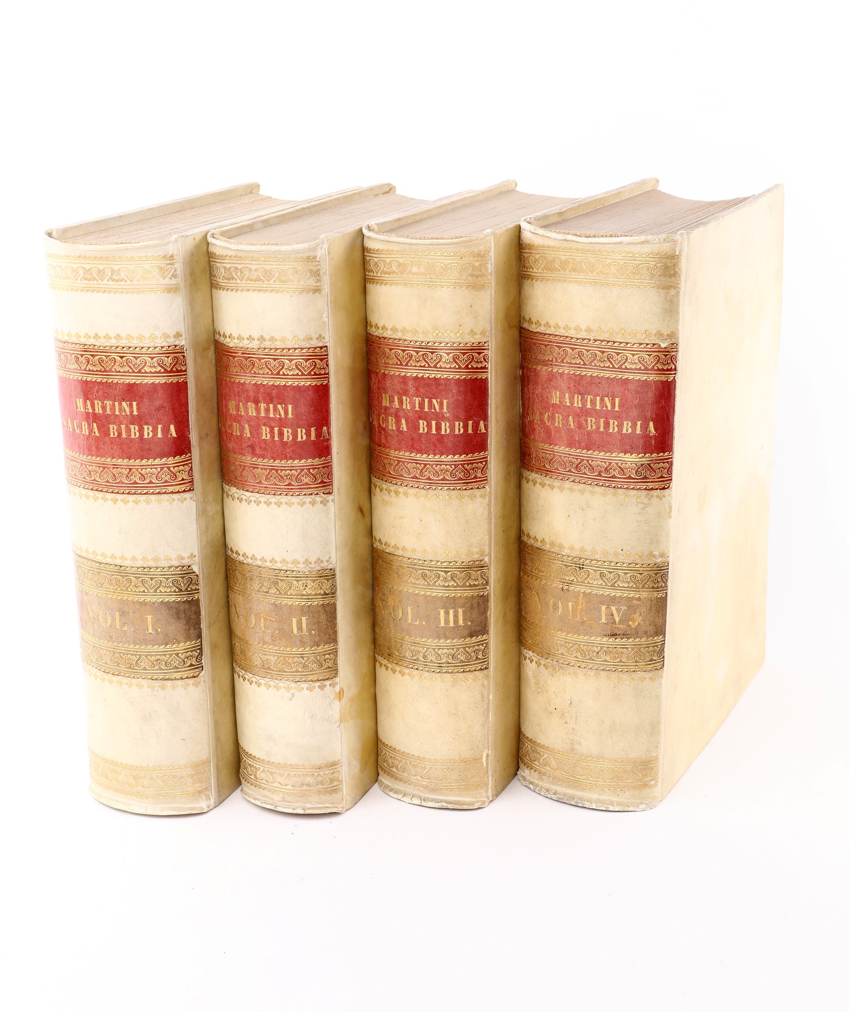In 4° Quattro volumi tutti con proprio frontespizio figurato a colori. Edizione napoletana profusamente illustrata di metà Ottocento della classica traduzione dei testi biblici di Antonio Martini condotta sulla base del testo greco dei Settanta con la consulenza del rabbino di Firenze, Levi. Con 100 incisioni protette da veline, di cui 11 a colori fuori testo. Legatura coeva in piena pergamena con tasselli in pelle al dorso, titoli e fregi in oro. Tagli spruzzati.