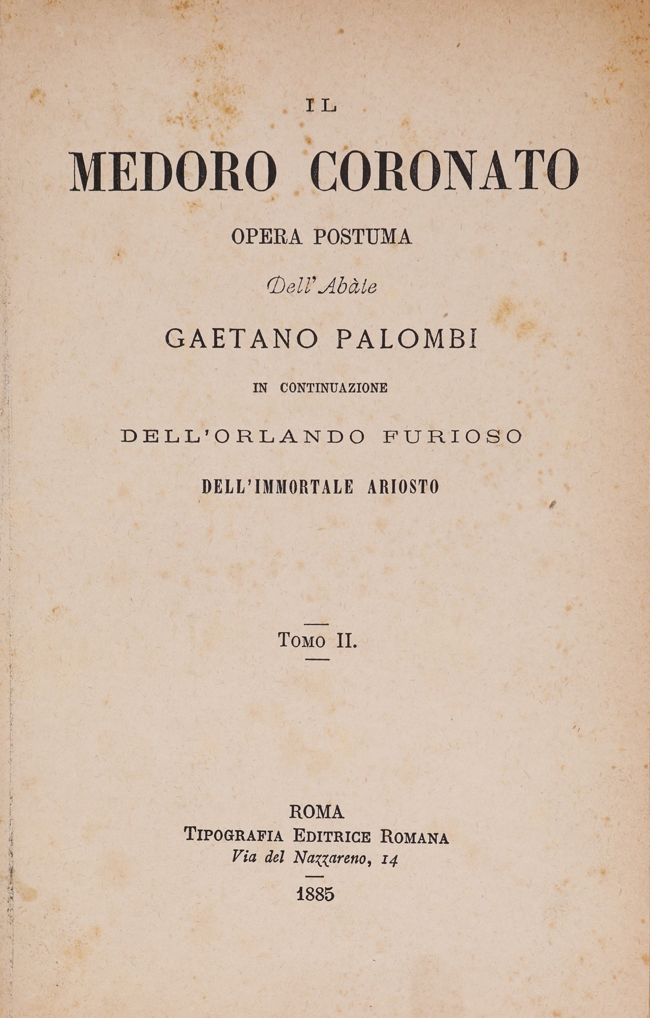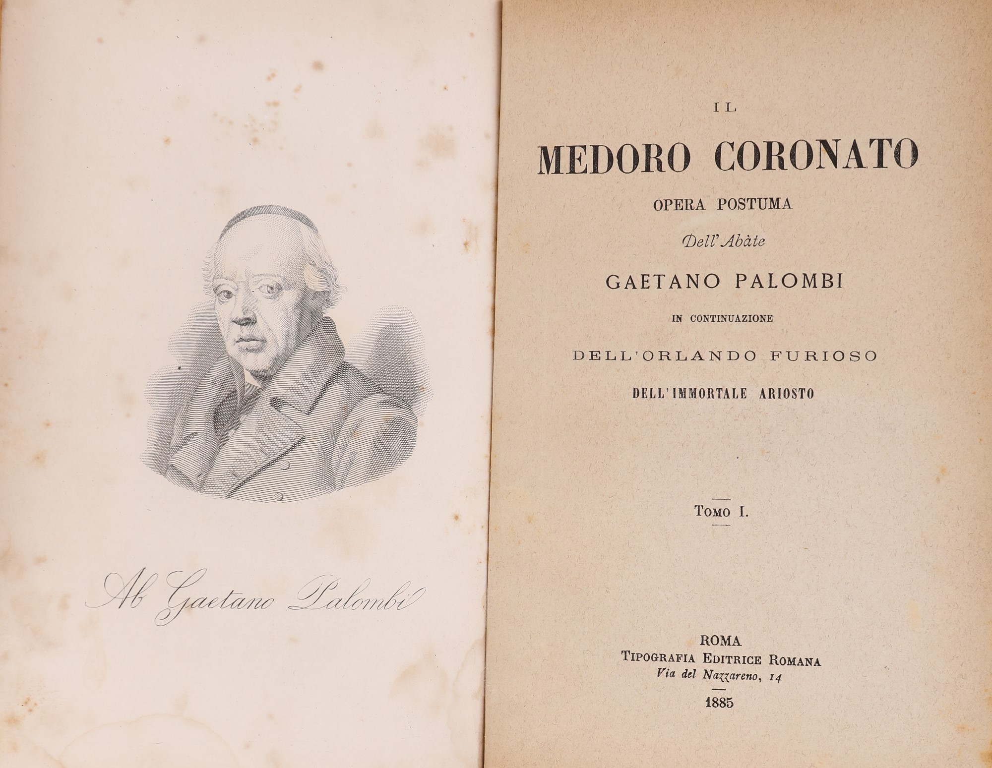 In 8° piccolo. Tomo I e II in 2 volumi. Ritratto inciso in antiporta del primo volume. Continuazione delle vicende narrate dall'Ariosto in venti canti in ottava rima. Rispetto all'opera originale mancano le figure di Orlando e Rinaldo mentre sono presenti Ferraù e Ruggero, Sacripante si converte cristiano e si sposa dando vita ad un tema encomiastico. L'opera si conclude con l'incoronazione di Medoro (da cui il titolo) sul trono del Catai. Legature in mezza pergamena ed angoli in pergamena con tassello in pelle con titolo in oro al dorso.