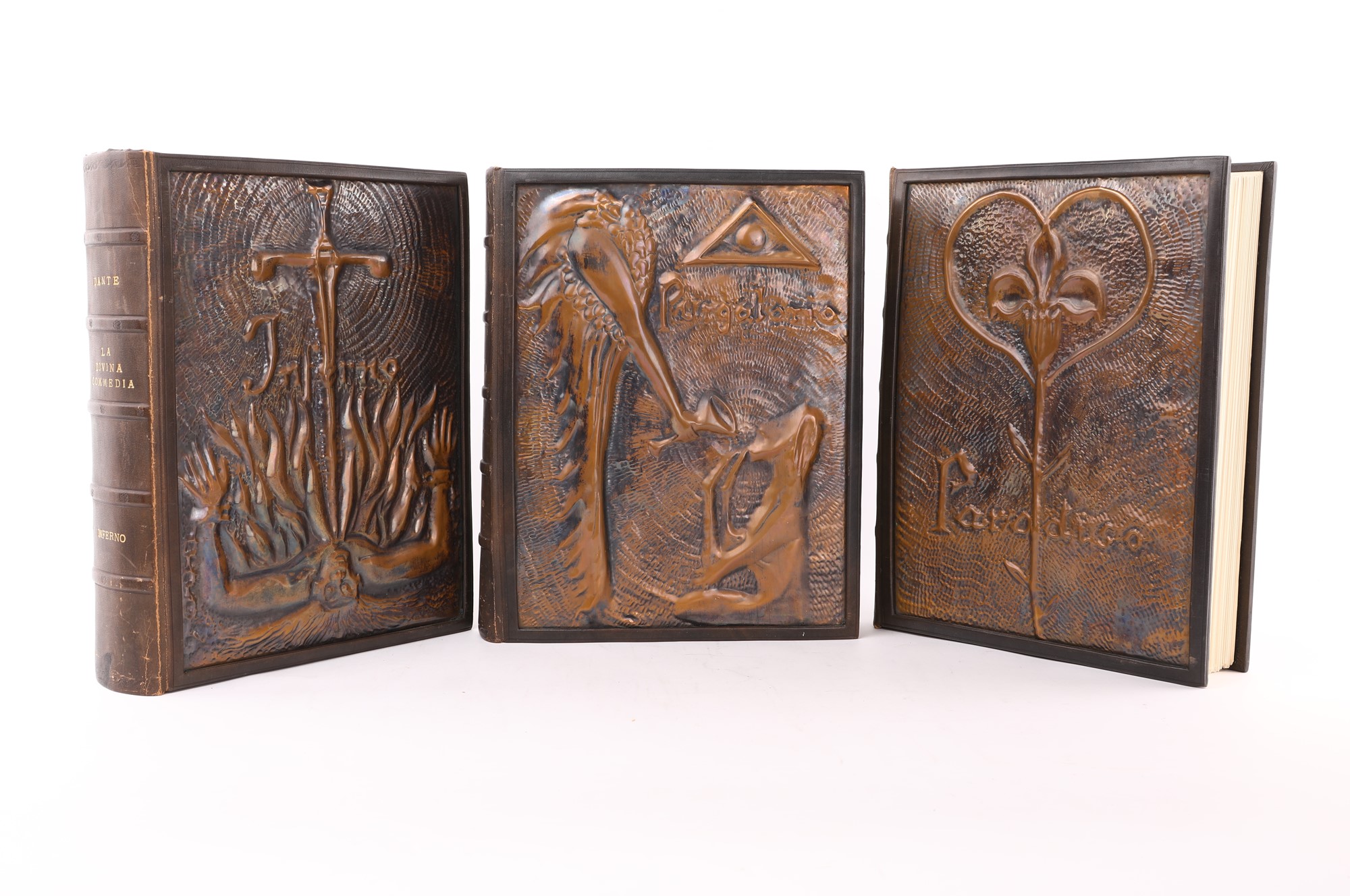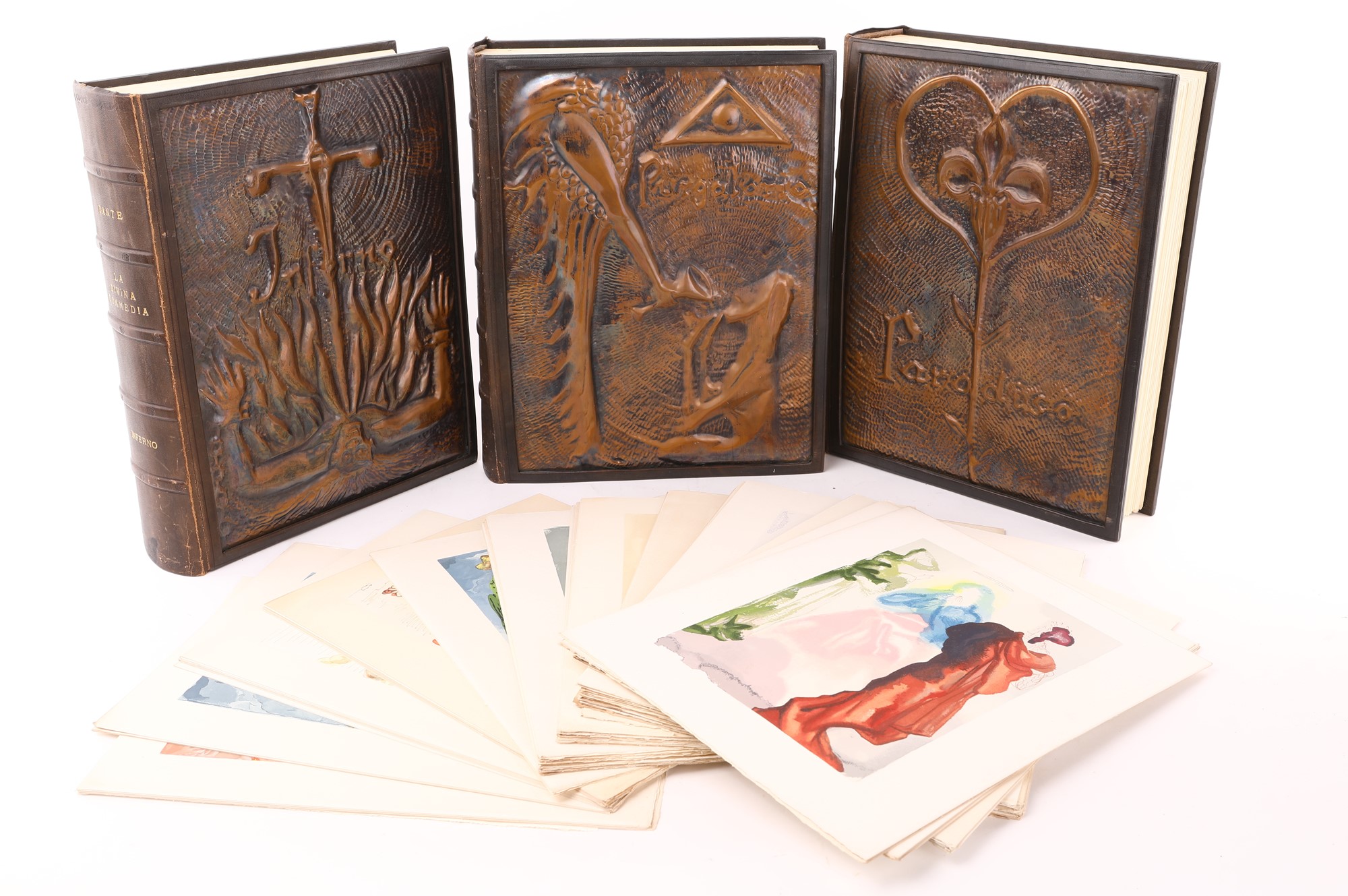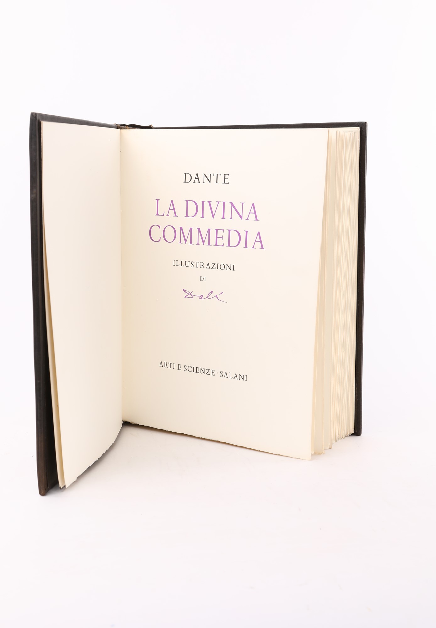 Sei volumi rilegati in 3 (Inferno, Purgatorio e Paradiso). In edizione di lusso con legatura artistica in pelle e piatti figurati in rame sbalzato. Le tre cantiche, secondo l'edizione della Società Dantesca Italiana rivista da Giovanni Nencioni, sono illustrate da 100 tavole a colori, (sciolte a parte) create da Salvador Dalì e realizzate dal Maestro Raymond Jacquet a Parigi. Impressa sotto la direzione di Giovanni Mardersteig in 2900 esemplari numerati (Ns 2769) dalla Stamperia Valdonega di Verona su carta a mano dei Fratelli Magnani di Pescia. Questa magnifica edizione viene giustamente considerata uno dei capolavori dell'opera di Dalì illustratore. Realizzata in occasione del 700° Anniversario della nascita di Dante. Entro cofanetti di legno rivestiti in pelle.
