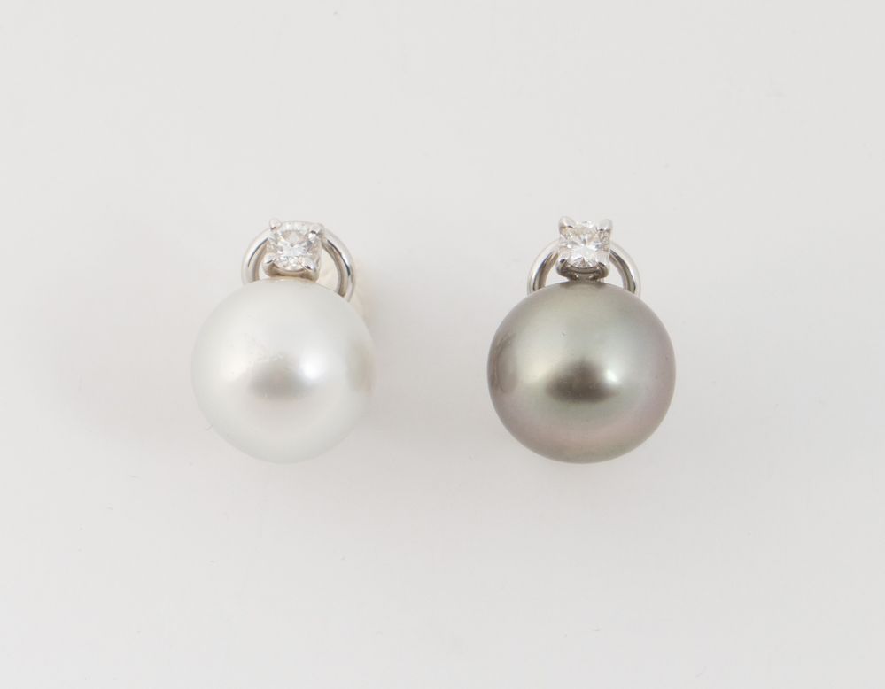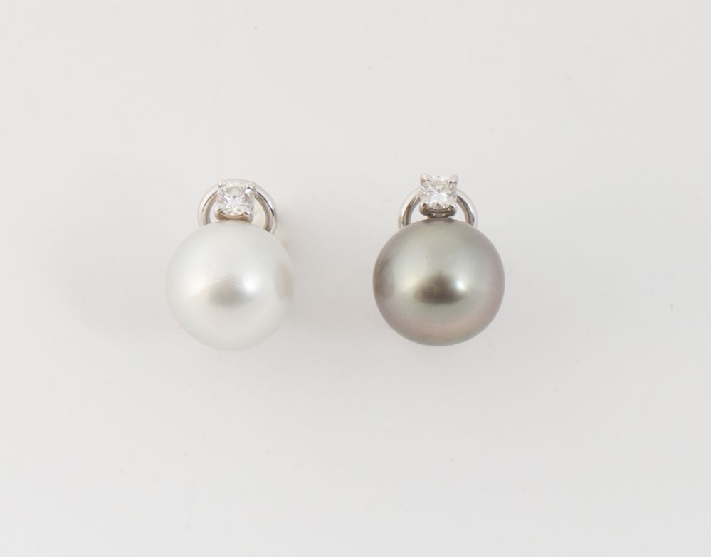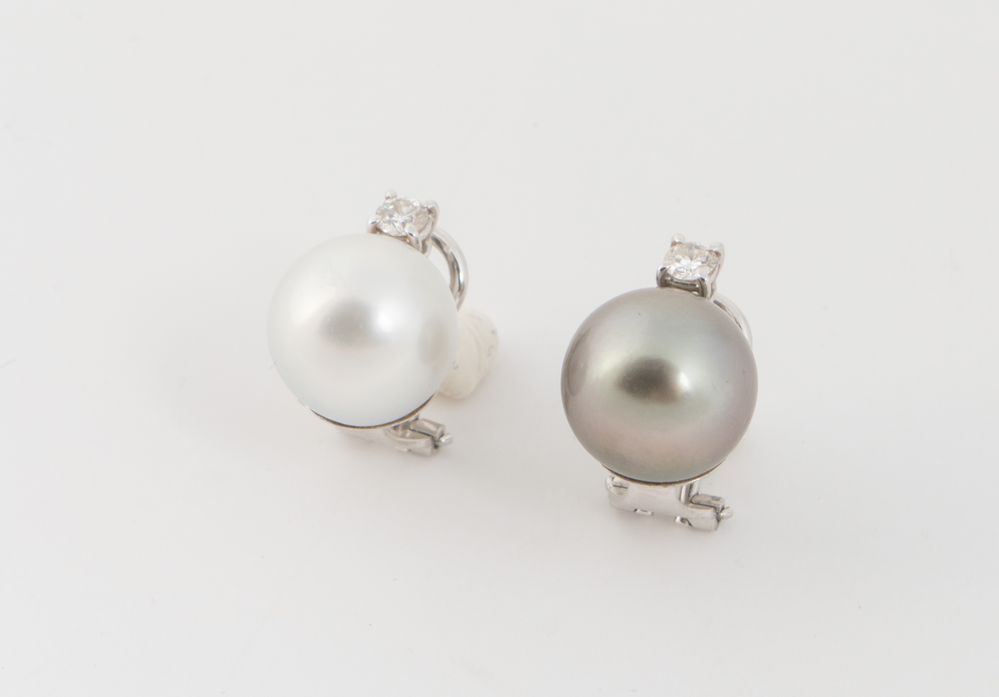 In oro bianco, ciascuno realizzato come una clip in oro bianco recante una perla coltivata dei mari del Sud “South Sea” (diametro 11,5 mm) sormontata da un brillante per un peso stimato di 0,25 ct.
