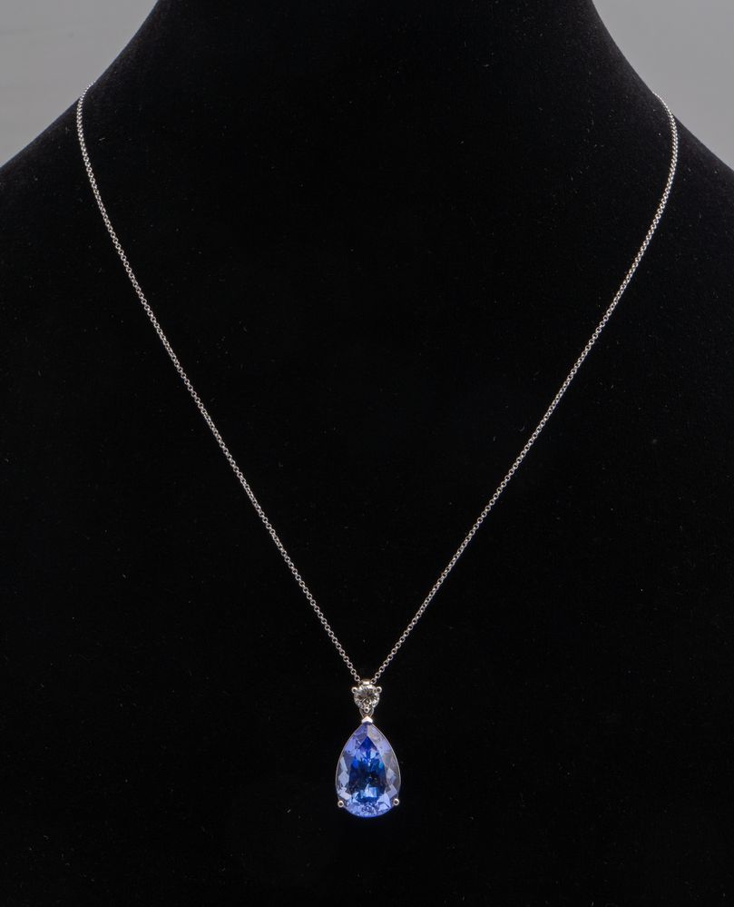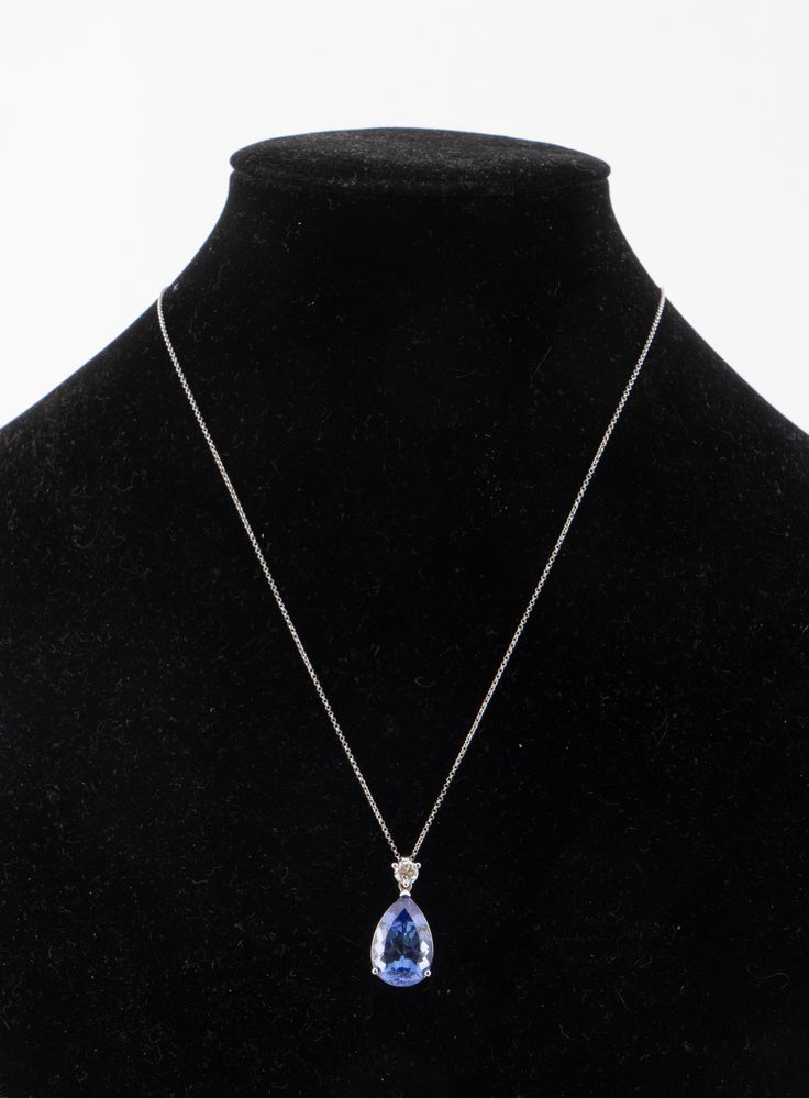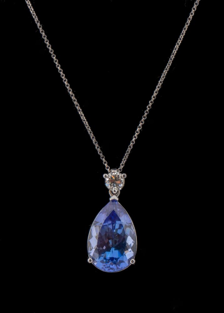In oro bianco, realizzata con catena sottile e pendente centrato da grande goccia di tanzanite del peso di 12,26 ct sormontata da diamante di 0,48 ct. Lunghezza 42,5 cm