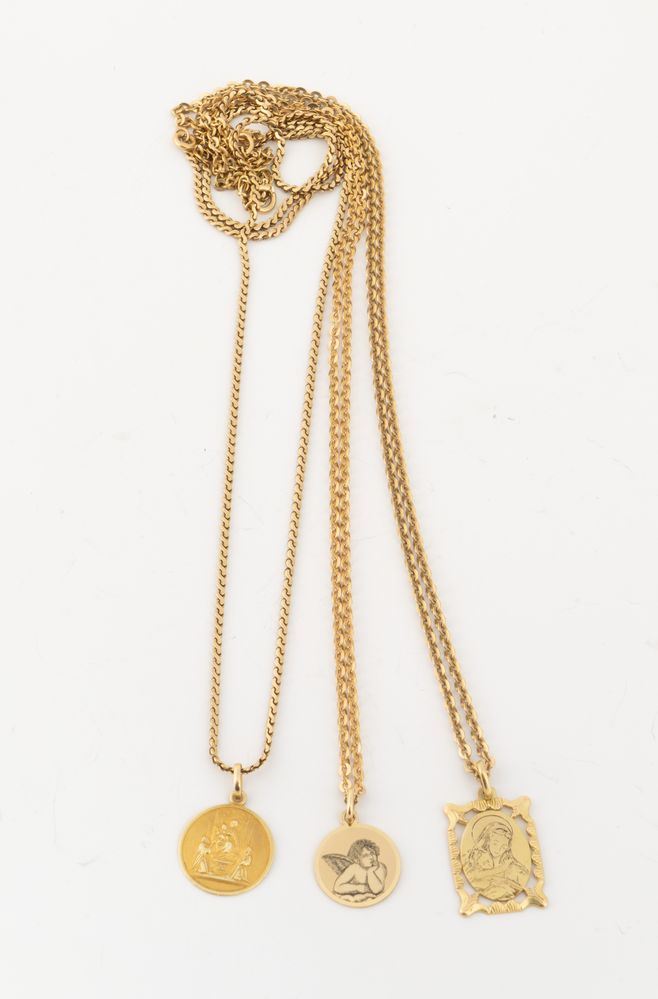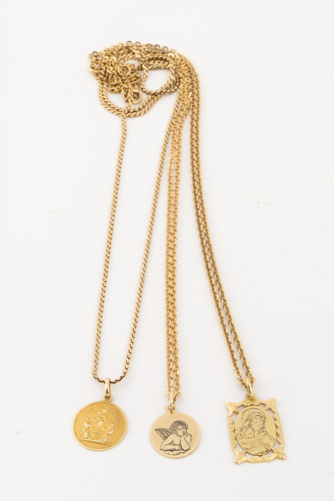 Ciascuna costituita da catenina e ciondolo a soggetto religioso in oro.