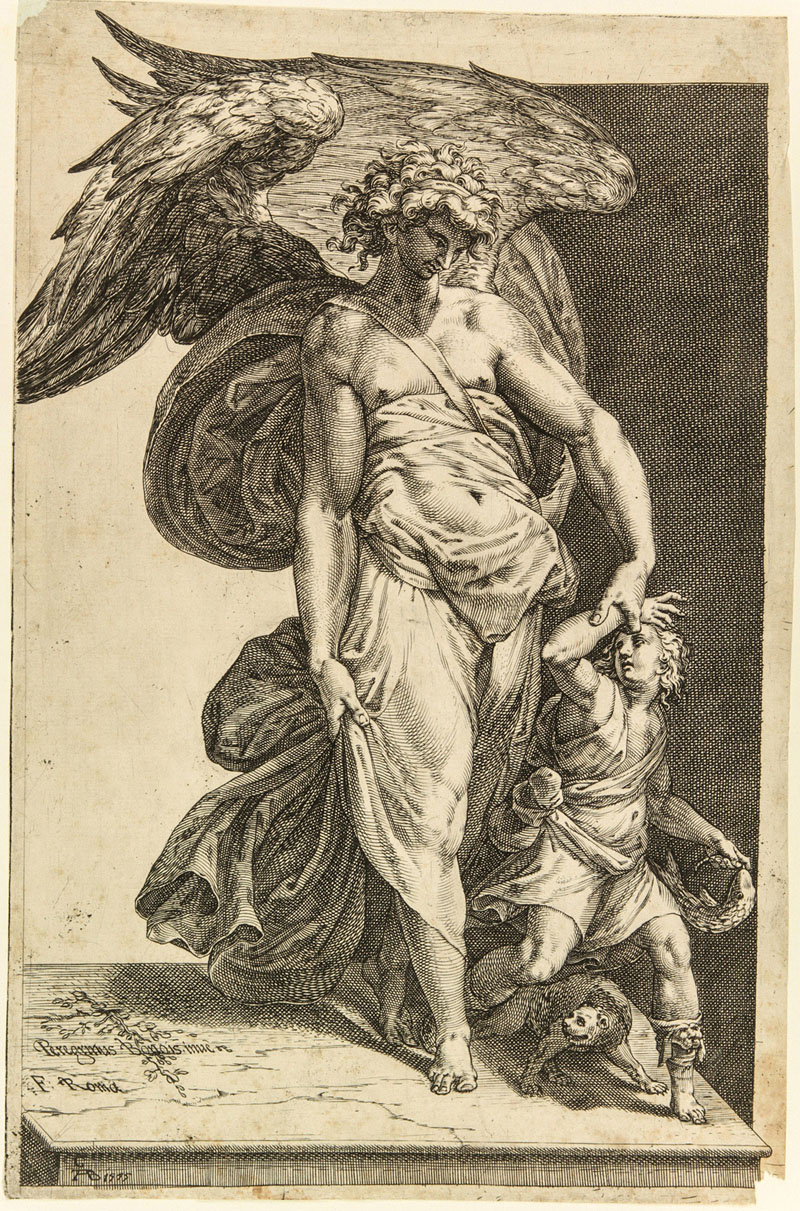 Cherubino Alberti (1533-1615). Tobiolo e l’Angelo. 1575. Bulino. Foglio: mm 317x208 ca. Bartsch XVII.70.58. In basso a sinistra, sul piano delle figure: "Peregrinus Bono.is inve. F. Romae"; inferiormente, è il monogramma dell'artista: "'CAB 1575". Sul verso sono presenti antiche iscrizioni e cifre manoscritte a penna. Da Pellegrino Tibaldi. Conosciuto in unico stato. La stampa, perfettamente inchiostrata e ben definita su carta bianca a vergelle, è rifilata ai margini; il foglio è attaccato a un passe-partout per due punti lungo il margine superiore. Vi sono alcune piccole mancanze (per esempio nell'angolo inferiore destro) e tracce di antichi restauri, ma nel complesso è in buone condizioni.