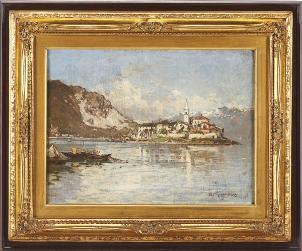 Eugenio Gignous "L'isola dei Pescatori" olio su tela (cm 35x47) Firmato in bass