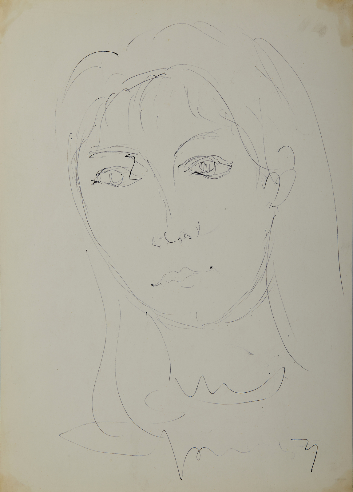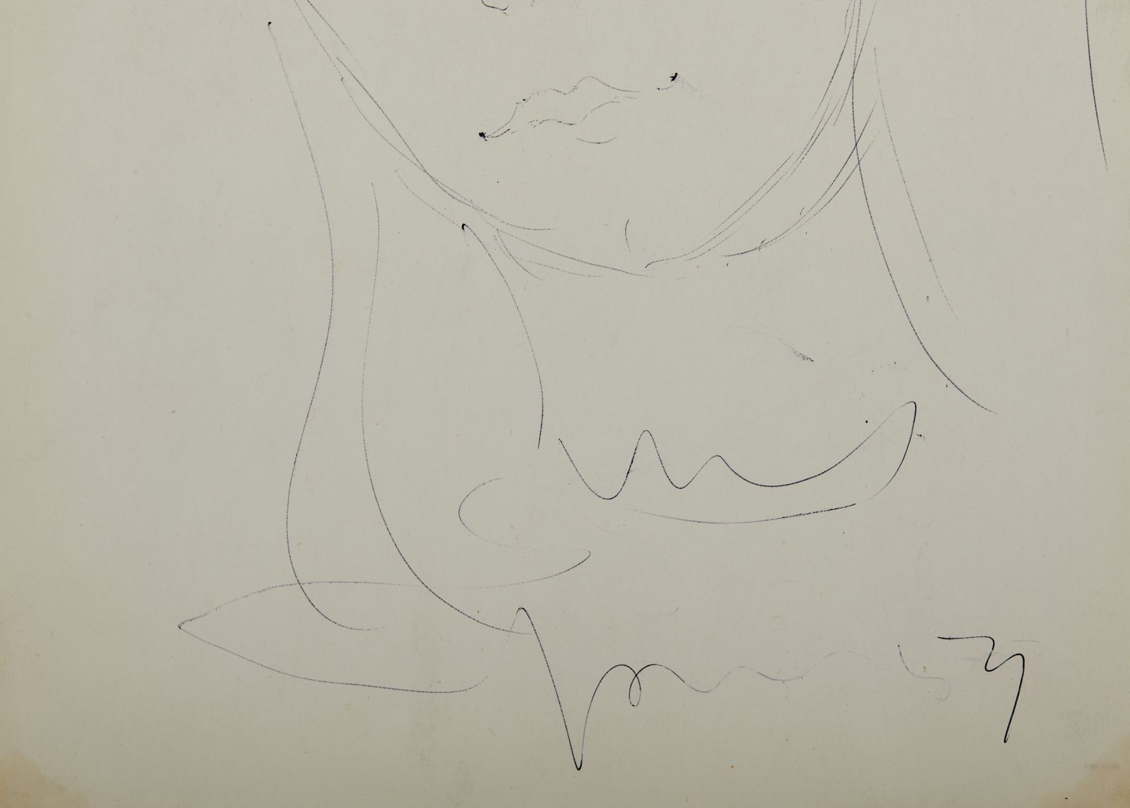 FONTANA LUCIO (1899 - 1968) Ritratto femminile. 1953. Biro su carta. Cm 24,70 x 34,60. Firma e anno in basso a destra a biro. Opera archiviata presso la Fondazione Lucio Fontana, Milano, come da documentazione fotografica allegata all'opera riportante il relativo numero d'inventario. Provenienza: Collezione Teresita Fontana, Milano; Collezione privata. Lievi difetti.
