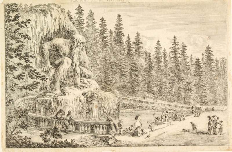 Stefano Della Bella (1610-1664). Il Gigante di Pratolino. 1657. Acquaforte. Matrice: mm 246x380. Foglio: mm 259x395. JOMBERT 1772, n. 178; DE VESME – MASSAR 1971, n. 838; FORLANI TEMPESTI (1973), pp. 97-98, n. 52. Esemplare appartenente alla serie delle vedute della Villa Medicea di Pratolino, eseguite da Stefano della Bella al suo ritorno a Firenze, forse per conto di Mattias de' Medici (cfr., anche per la bibliografia precedente, BARONI 2011, pp. 41-46, in part. 45-46). Furono stampate per la prima volta soltanto nel 1742 dagli stampatori granducali Tartini e Franchi per illustrare la pubblicazione di Bernardo S. Sgrilli intitolata: Descrizione della Regia Villa, fontane e fabbriche medicee di Pratolino. L'esemplare è su carta bianca a vergelle con filigrana; non è rifilato, conserva buoni margini ed è ancora ben fresco. Foxing diffuso, soprattutto lungo i bordi del foglio dove sono presenti alcune mancanze.