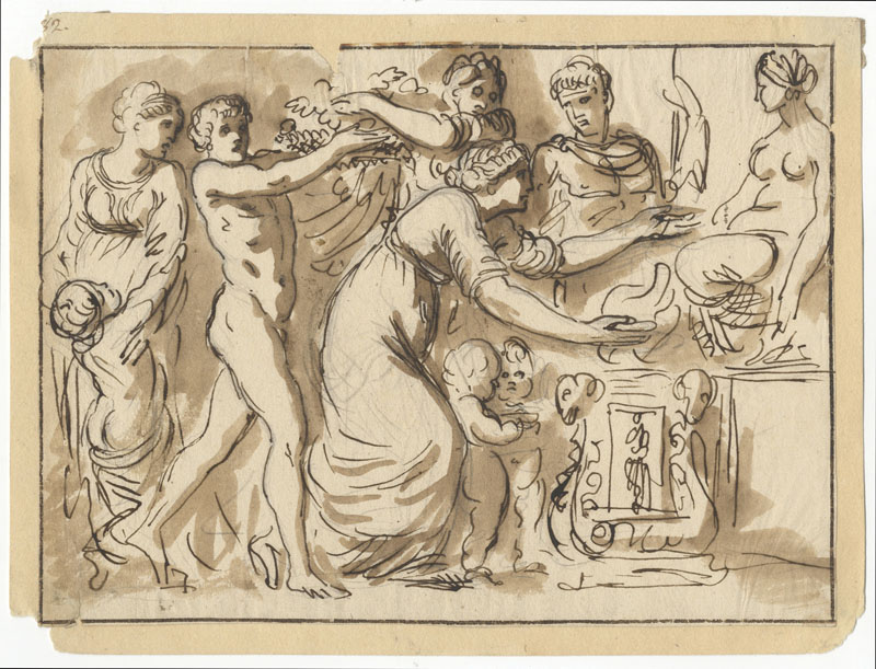 Giuseppe Fancelli (1763-1840). Scena di sacrificio. Fine del XVIII secolo. Penna e inchiostro, matita nera, inchiostro acquerellato; carta bianca fine a vergelle. Foglio: mm 155x209. Rara opera grafica dell'artista che nell'800 trovò poi fortuna nella sua città come specialista di monumenti funerari, eseguiti in collaborazione con il fratello. Il foglio è parzialmente incollato al supporto sottostante dal verso del lato sinistro. La carta alla quale è attaccato è pesante e bianca a vergelle (sec. XVIII). Sono presenti alcuni strappi e mancanze lungo i lati.