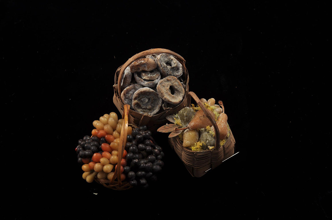 Lotto composto da tre cestini in vimini con frutta e freselle