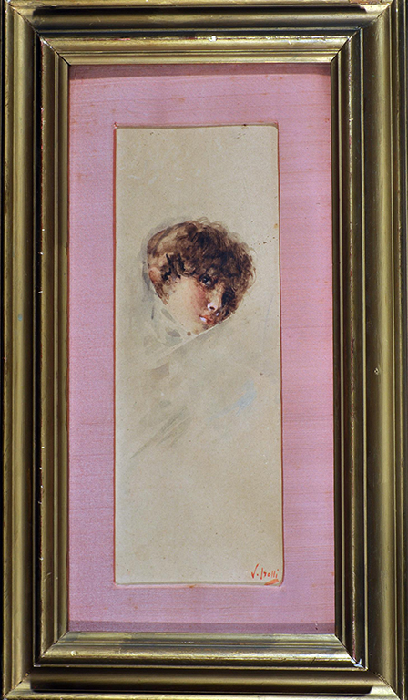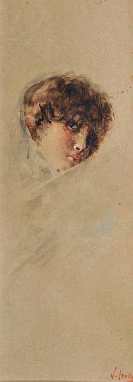 Irolli Vincenzo (Napoli 1860 - 1949) Profilo femminile acquarello su carta cm 28x11 firmato in basso a destra: V. Irolli