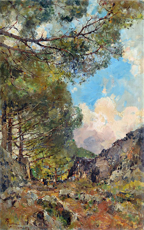 Casciaro Giuseppe (Ortelle, LE 1863 - Napoli 1941) Paesaggio olio su tela, cm 59x37,5 firmato e datato in basso a sinistra: G. Casciaro 24