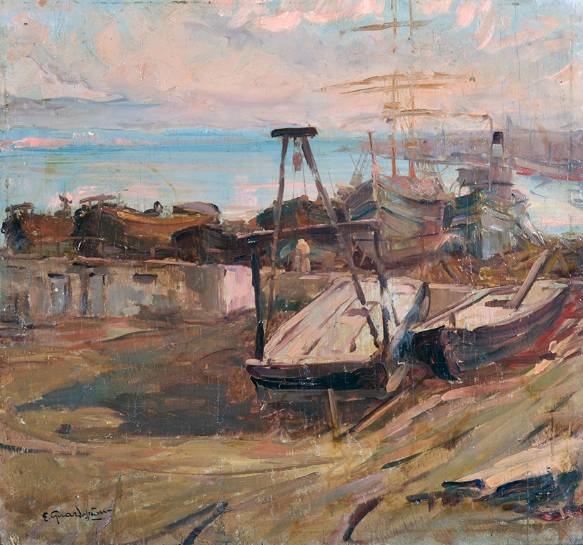 Guardascione Ezechiele (Pozzuoli, NA 1875 - Napoli 1948) Barche a secco olio su tavola cm 43x45 firmato in basso a sinistra: E. Guardascione