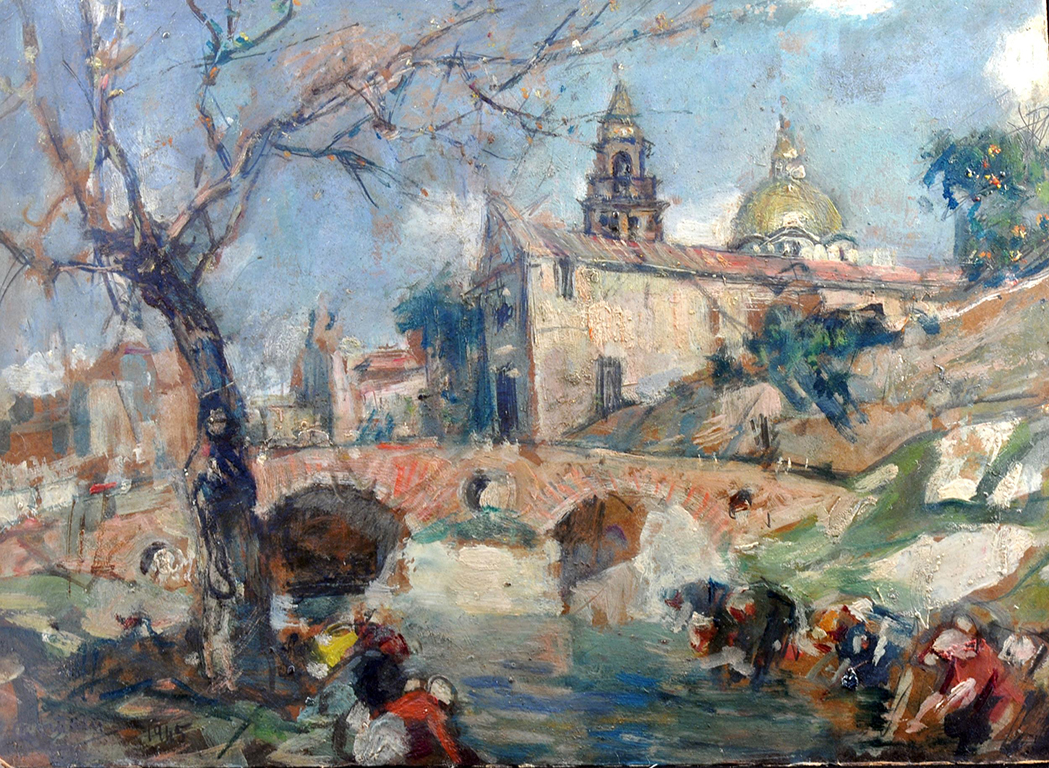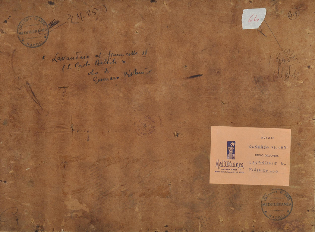 Villani Gennaro (Napoli 1885 - 1948) Lavandaie al fiumicello olio su cartone cm 29,5x39,5 firmato e datato in basso a sinistra: G. Villani 1945 a tergo cartiglio e timbri Gall. Mediterranea Napoli: timbro Bottega d'arte U. Errico, Napoli Bibliografia: C. Munari - D. Rea - C. Ruju, Linea figurativa napoletana 1930-1980, Centro d'Arte Serio, Napoli 1980, pag. 102, fig. 34