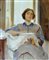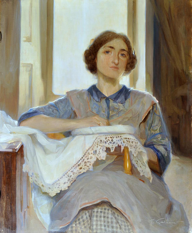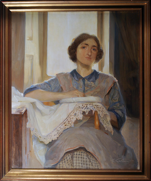 Galante Francesco (Margherita di Savoia, FG 1884 - Napoli 1972) Ricamatrice olio su tela, cm 63x51,5 firmato in basso a destra: F. Galante