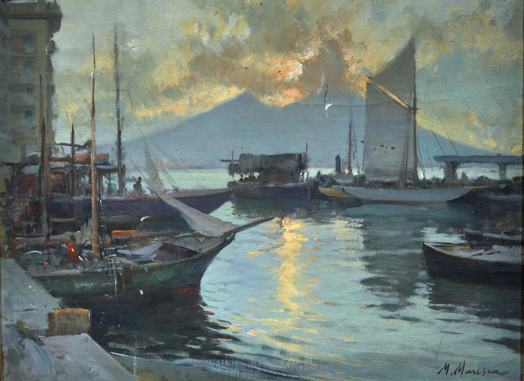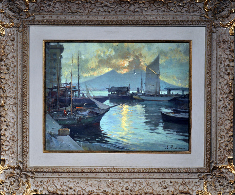 Maresca Mario (1877 - ?) Tramonto nel golfo olio su tela, cm 34x45 firmato in basso a destra: M. Maresca