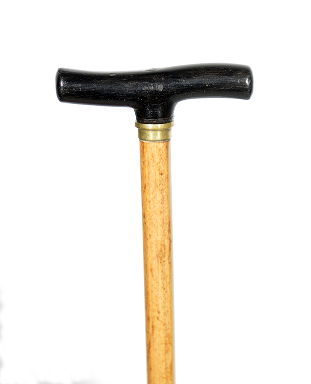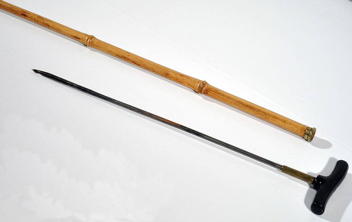 b)Bastone animato con fusto in bambù e impugnatura in legno a "tau". All'interno contiene lo strumento per prelevare dei campioni di legno dagli alberi prima della vendita. Questa pratica era vietata perchè spesso provocava il disseccamento dell'albero, per cui lo strumento veniva nascosto all'interno di bastoni dall'aspetto piuttosto grezzo.