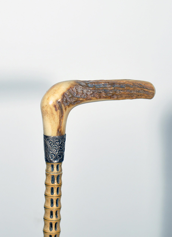 c)Bastone con fusto in vertebre di squalo, impugnatura in corno di cervo e ghiera in argento. Epoca inizi '800.