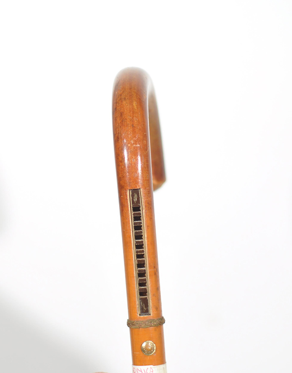 a) Bastone con fusto in malacca, impugnatura ricurva nel cui fusto è inserita un'armonica. Francia anni '30