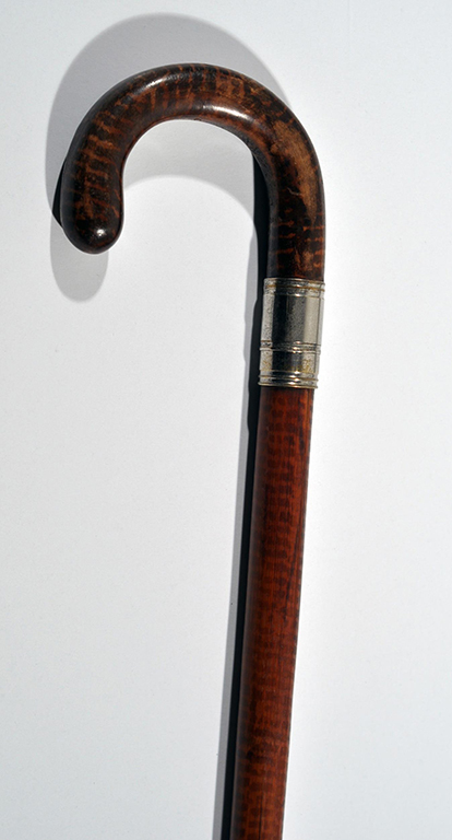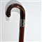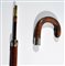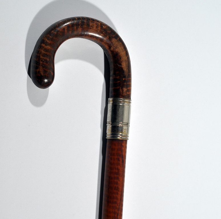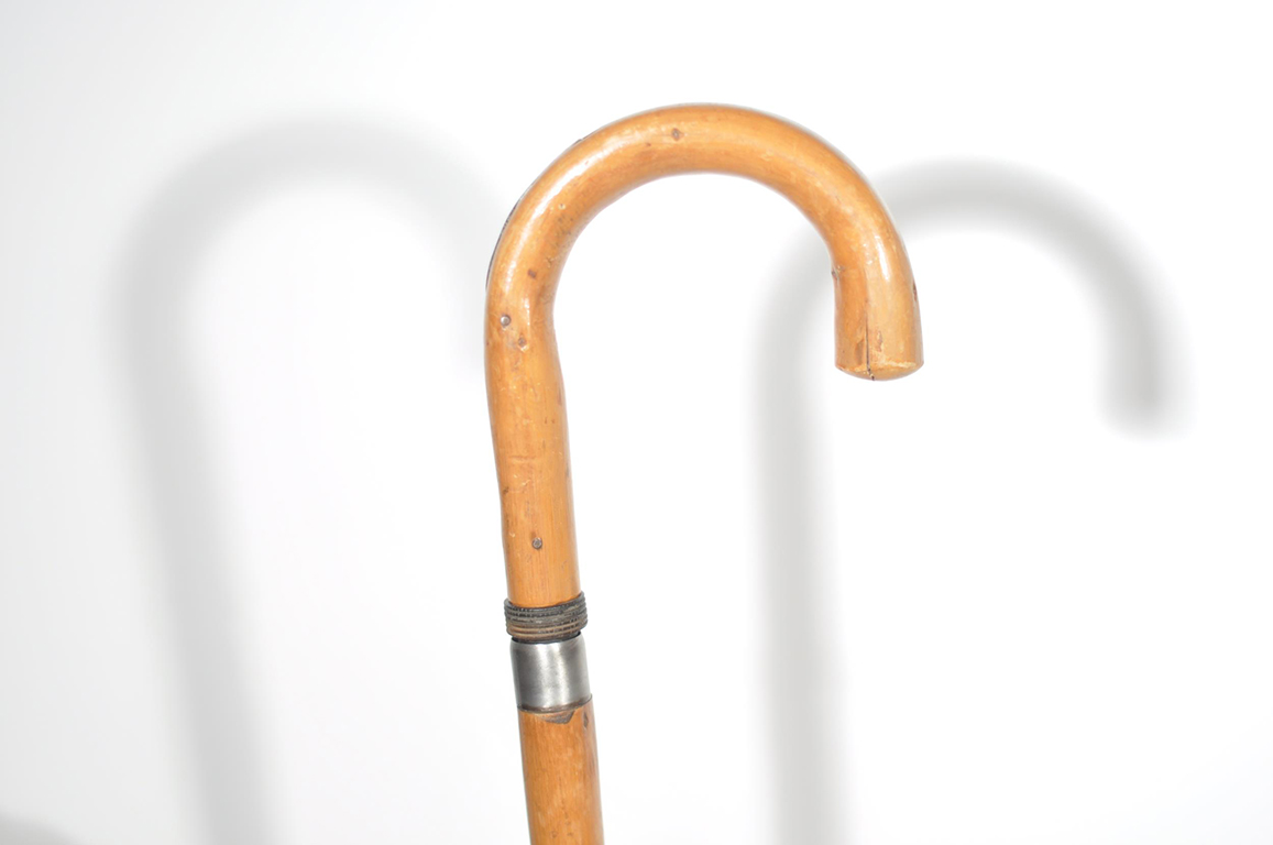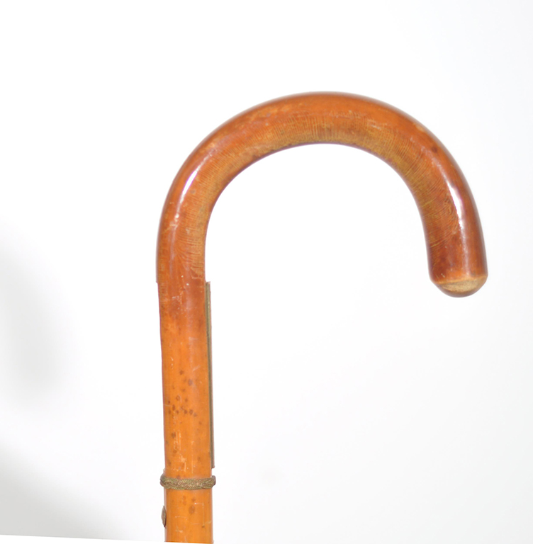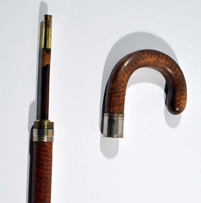 b) Bastone interamente in legno con impugnatura incurvata e ghiera in argento contenente una canna da pesca che si apre telescopicamente
