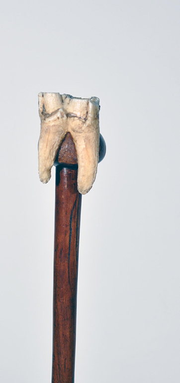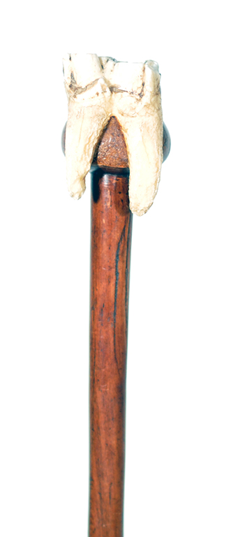 Fusto in noce; impugnatura sferica schiacciata, sulla quale è stata montato un grosso dente di elefante.