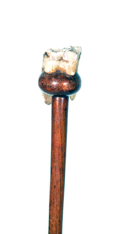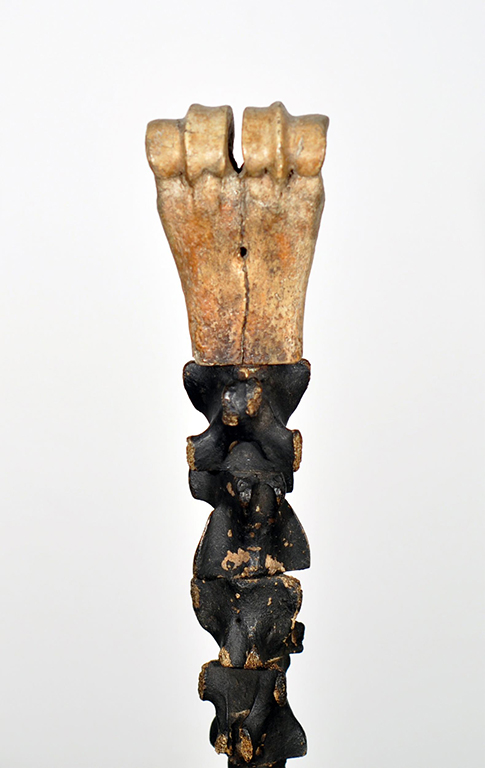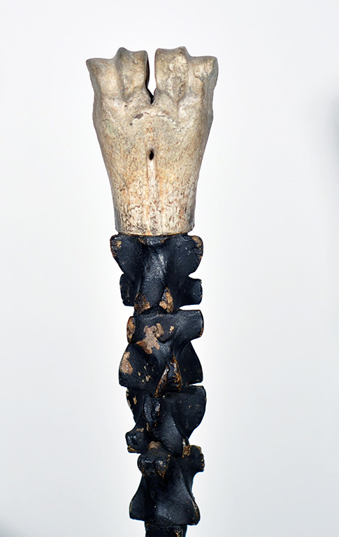 Fusto interamente realizzato con vertebre di coccodrillo annerite; impugnatura a pennacchio costituto da un unico osso di coccodrillo; puntale in ferro